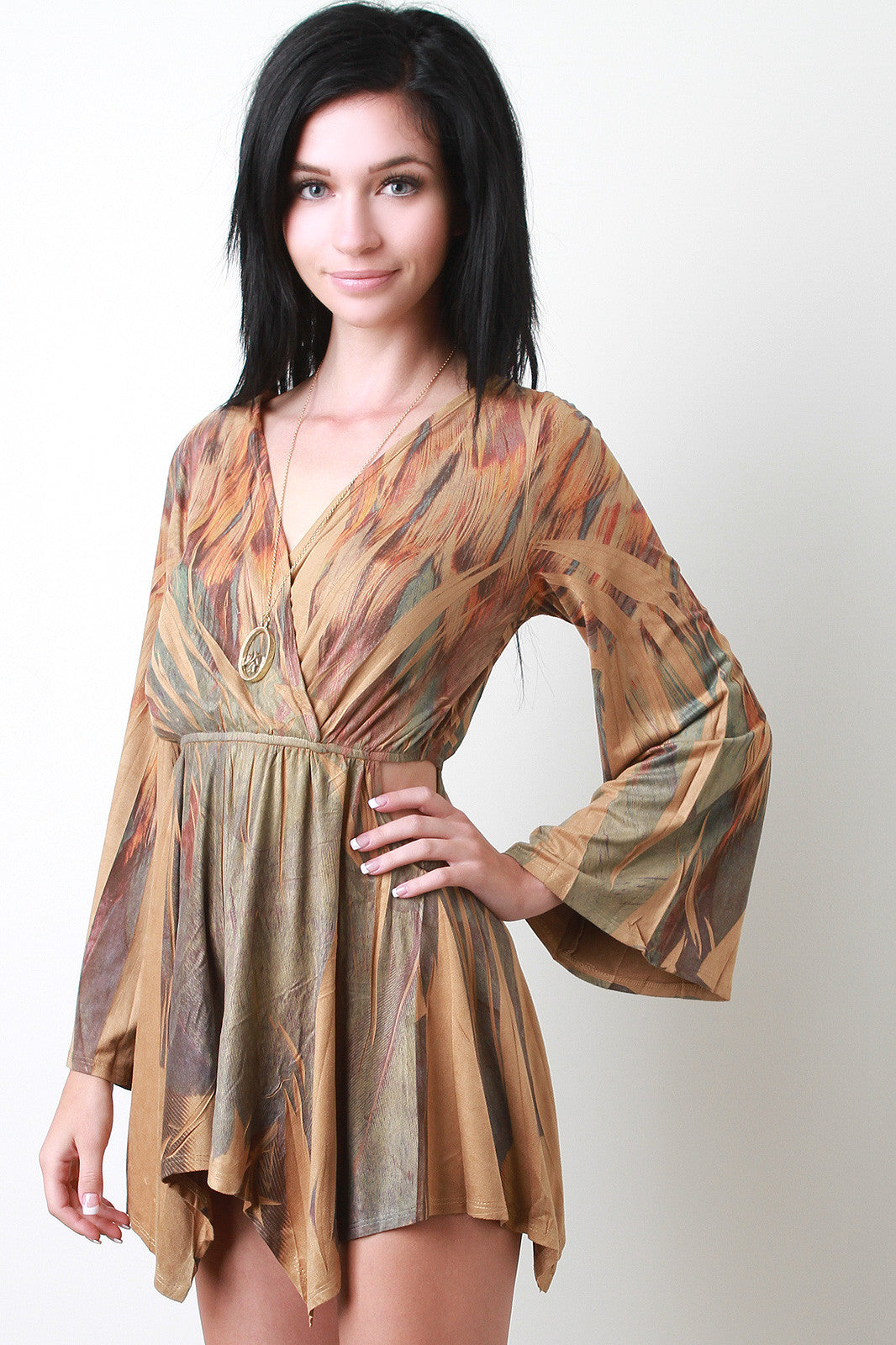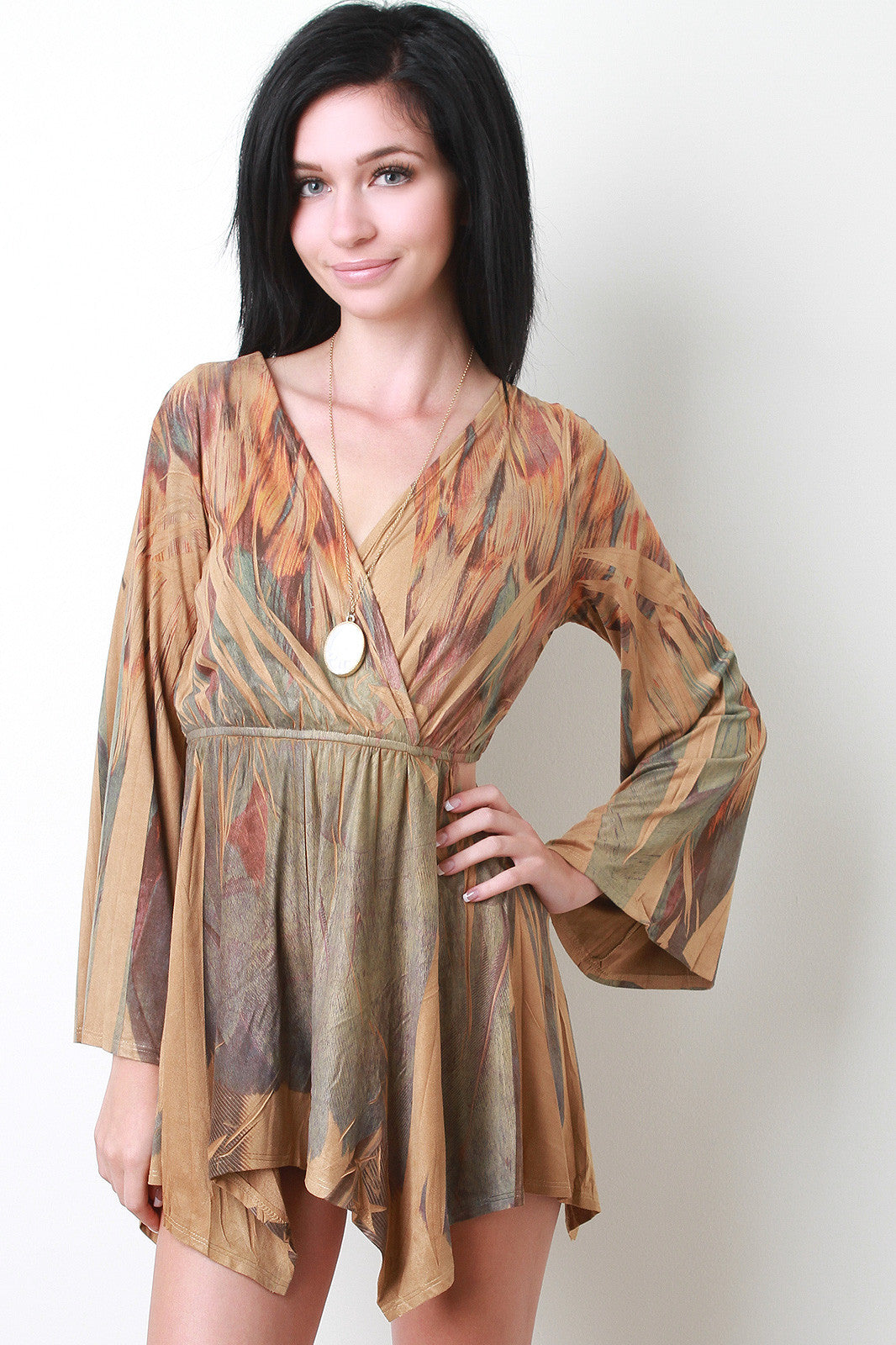 This romper features a surplice v-neckline, v-back with a secure self-tie sash at nape, long bell sleeves, cinched elasticized waist with side cutouts, and skirt inspired shorts bottom half. Accessories sold separately. Made in U.S.A. 95% Polyester, 5% Spandex.