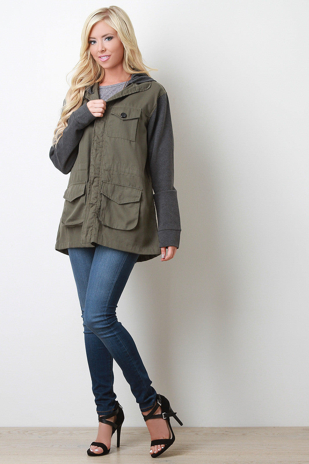 This jacket features a zipper front with button secure closure, cargo flap pockets, contrasting sleeves and hoodie back. Accessories sold separately. 60% Cotton, 35% Polyester.