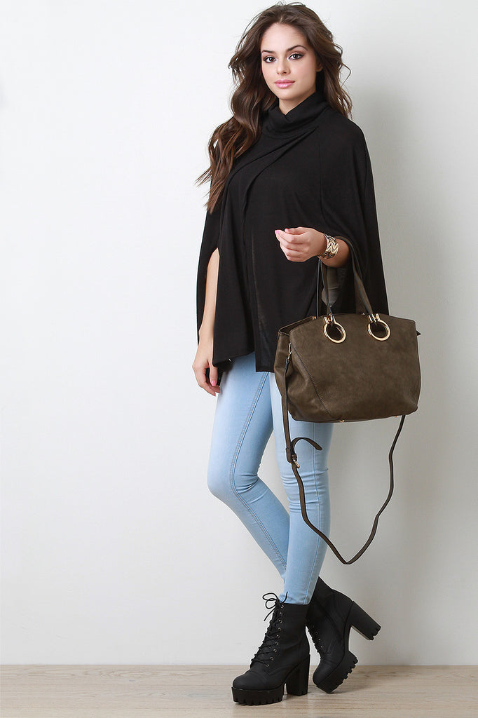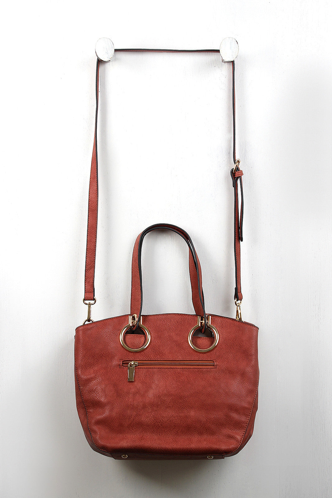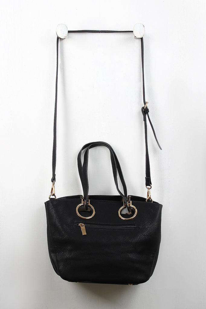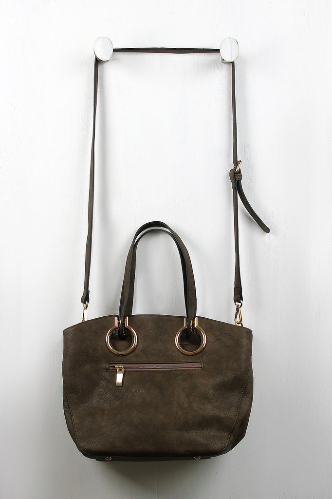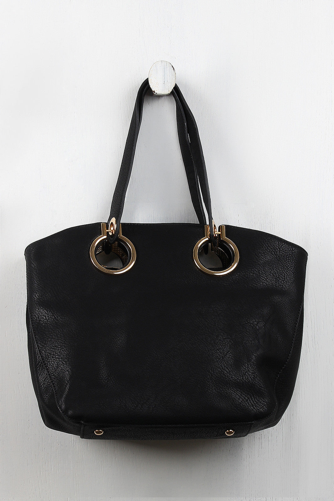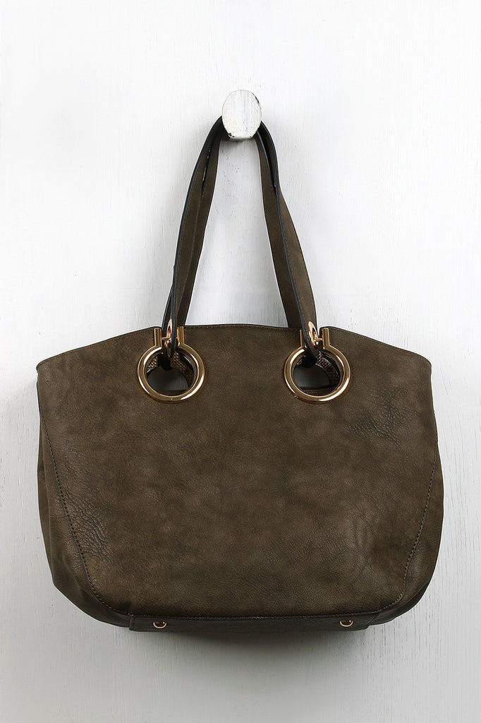 A medium-sized tote bag featuring flexible vegan leather, large grommets design, and two flat handles with a 7.5" drop. The top zips close and the interior features two slip pockets, one zipper pocket, and a center divider zipper pocket. The bag also has one exterior zipper pocket, four glossy round purse feet, and two side snap buttons for expansion. Includes an adjustable shoulder strap.