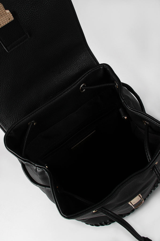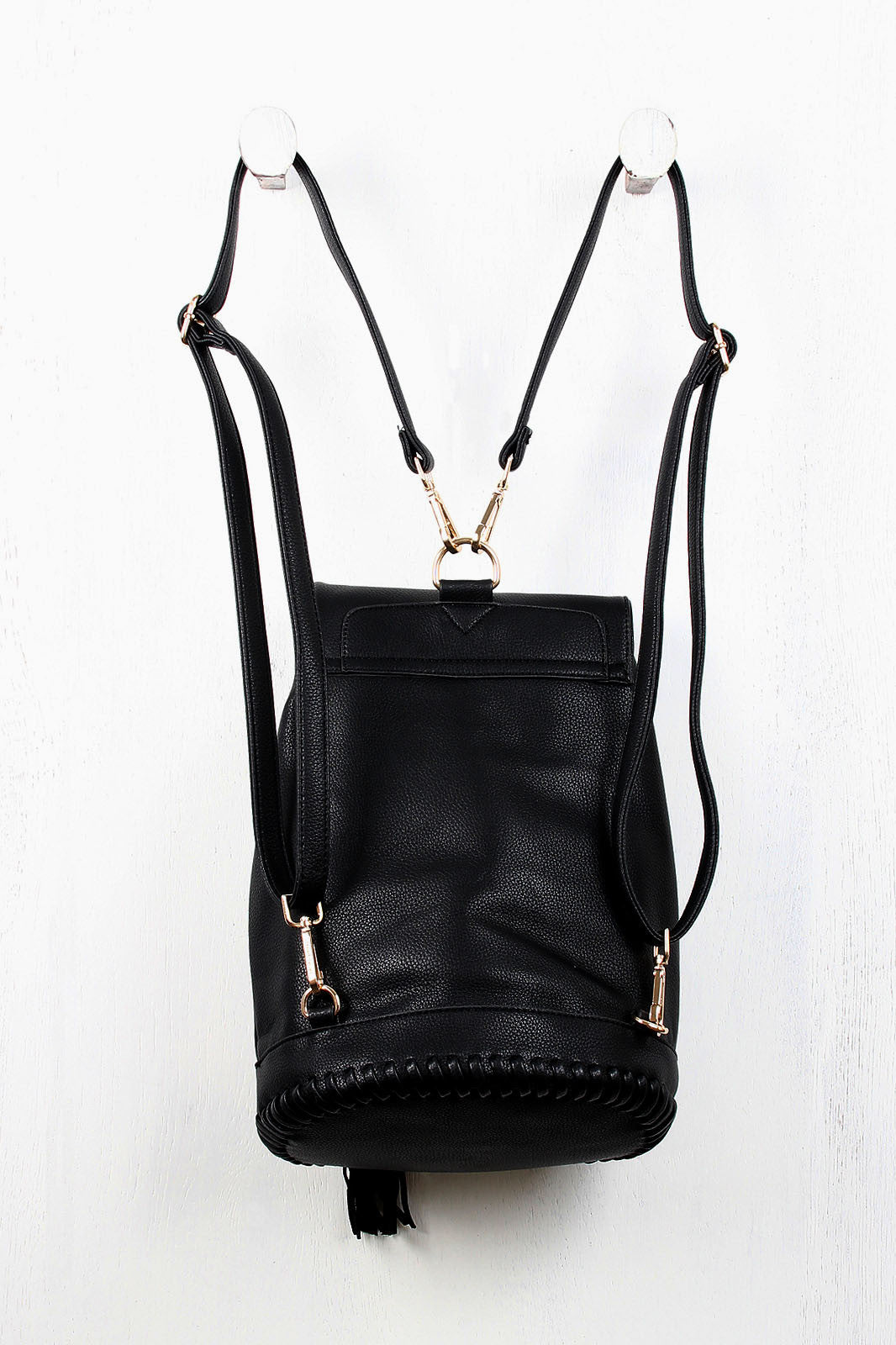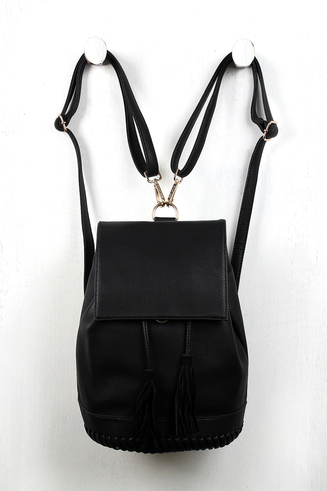 A trendy bucket-style backpack featuring pebbled vegan leather, a flap top with tuck lock clasp, and blanket stitched round base. The main compartment has a drawstring closure with genuine suede tassels and the lined interior has one slip pocket and one zipper pocket. The thin backpack straps are adjustable and detachable with lobster hooks. Hook a single strap onto the D-rings on the side for an alternate shoulder bag look!