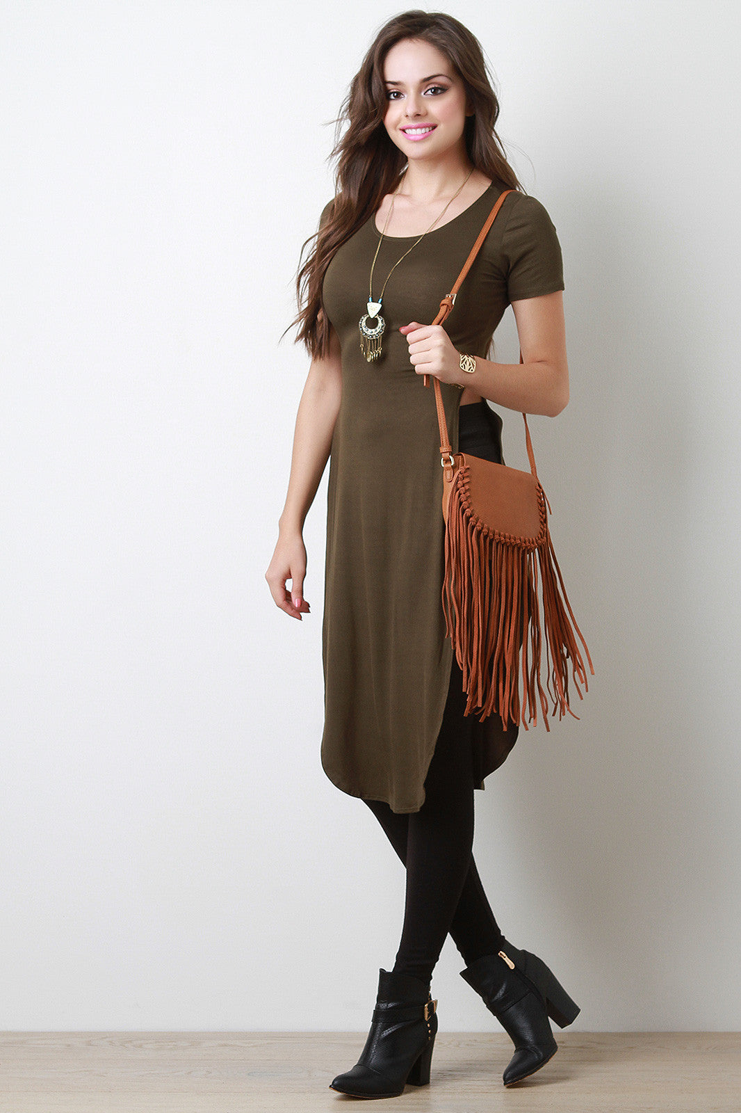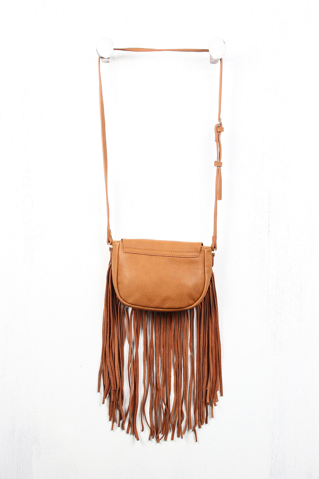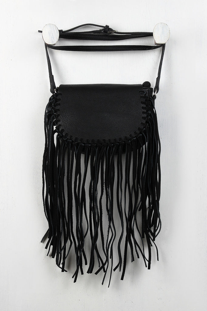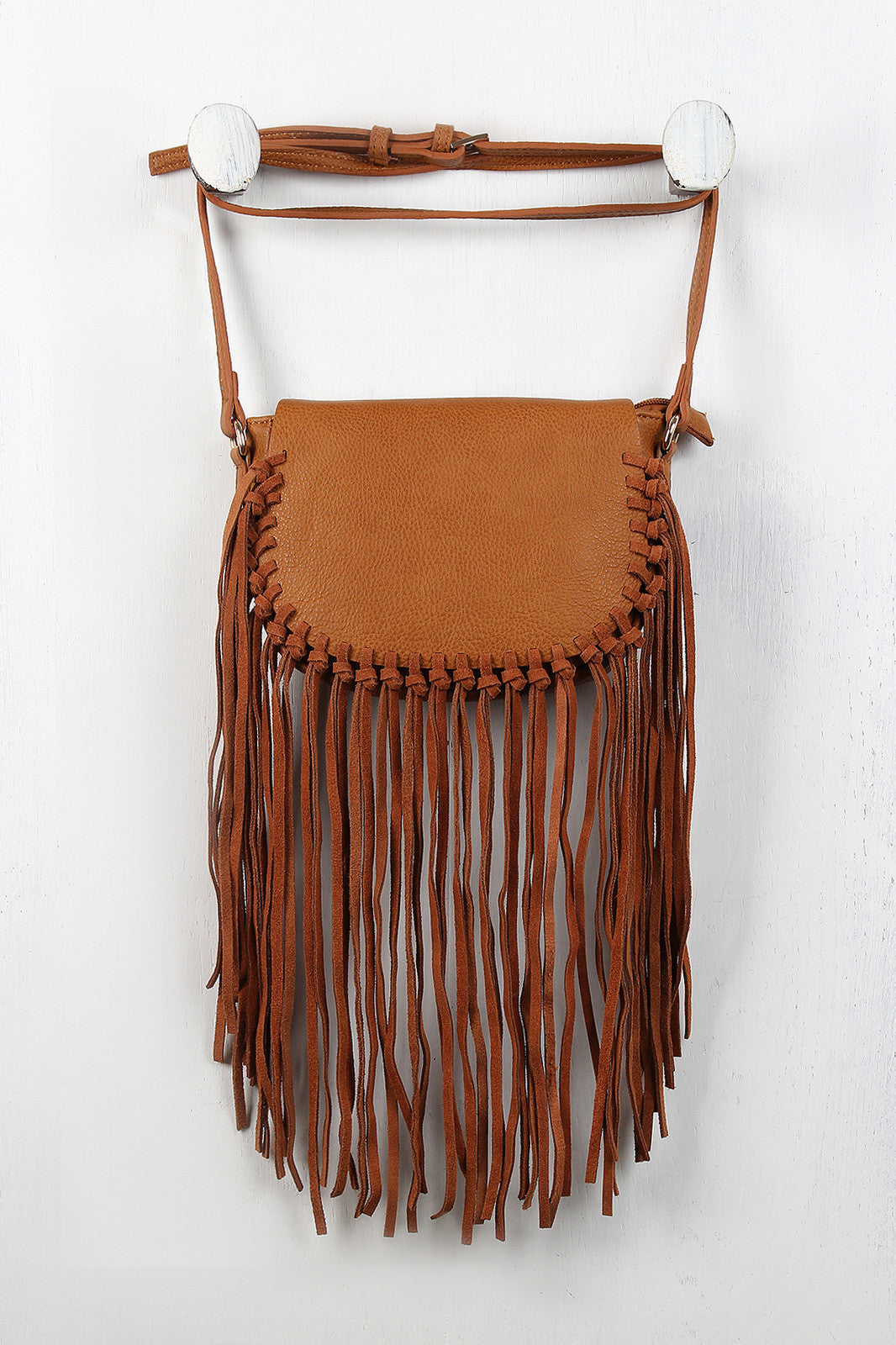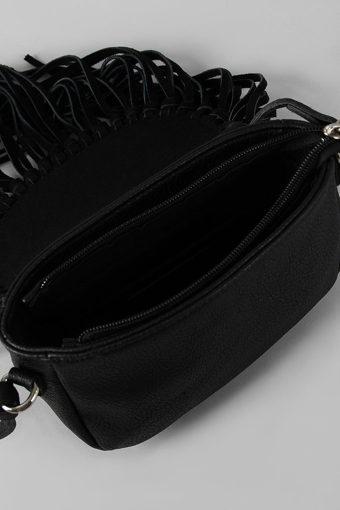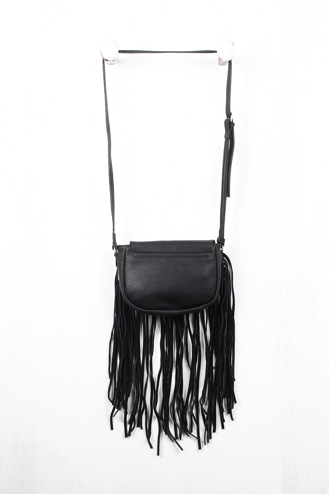 This pebbled vegan leather shoulder fringe and thin flat adjustable shoulder strap. The main compartment has a zipper closure and the interior is fully lined with two slip pockets.