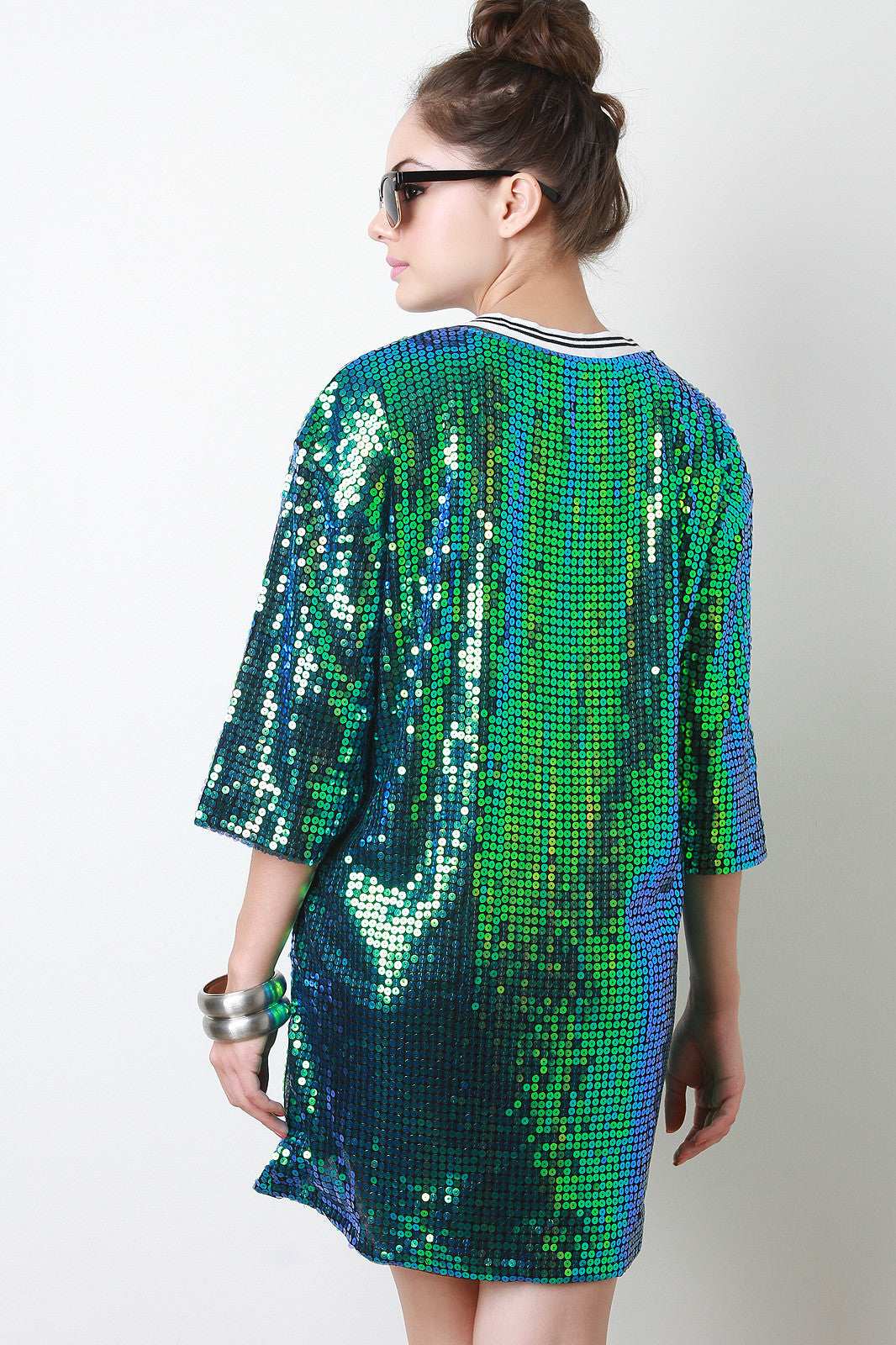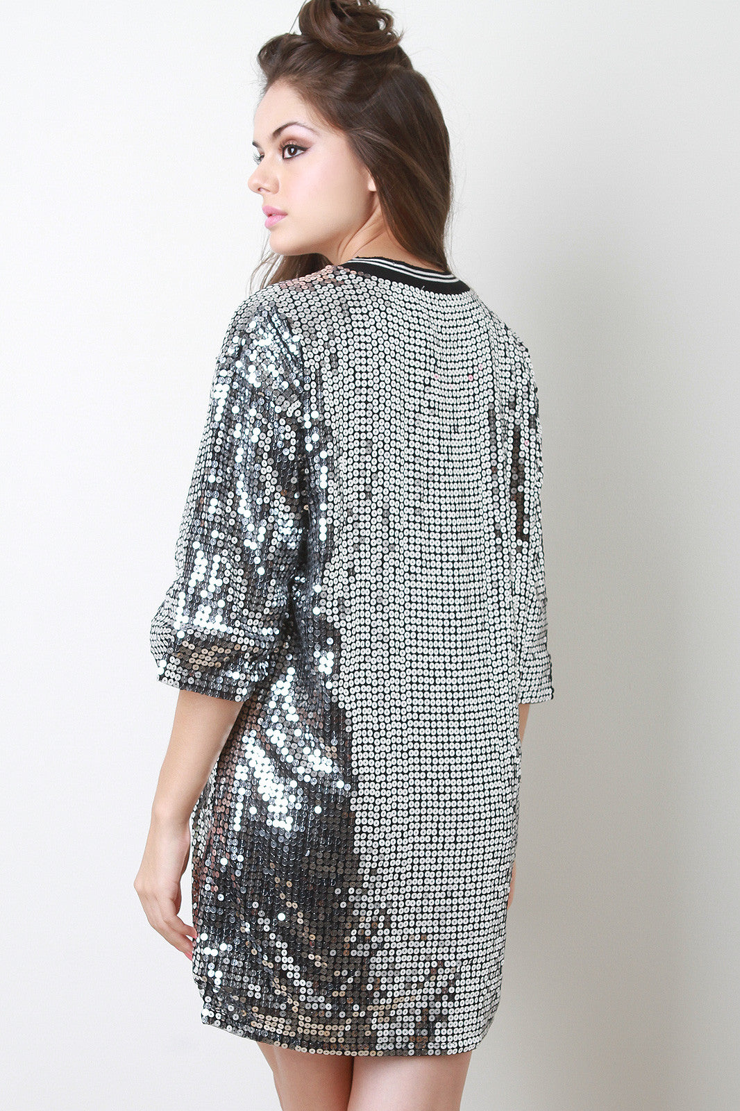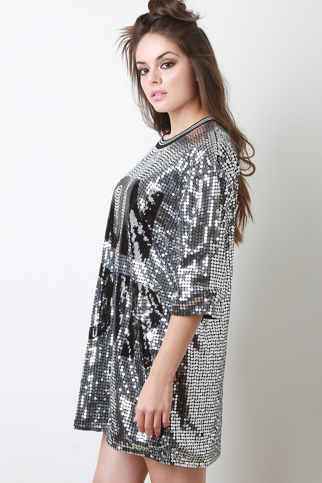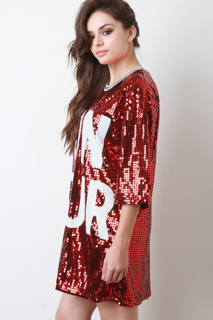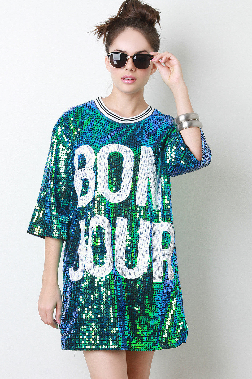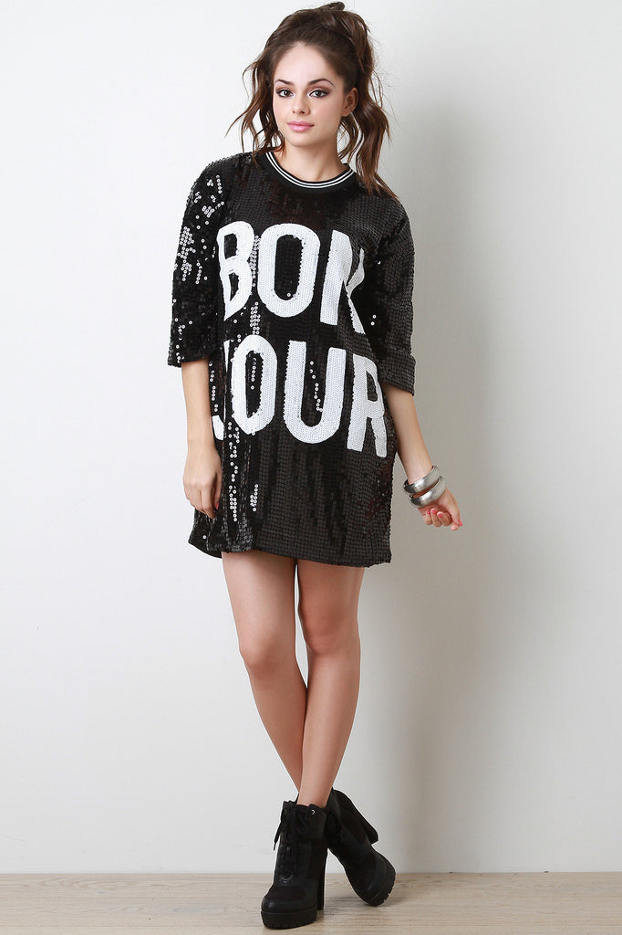 This gleaming dress features a stripe ribbed knit round neckline, short sleeves, boxy cut, sequins embellished design with the word "Bon Jour" at front, and fully lined. Accessories sold separately. Shell 1:100% Polyester, Shell 2: 100% Polyester.