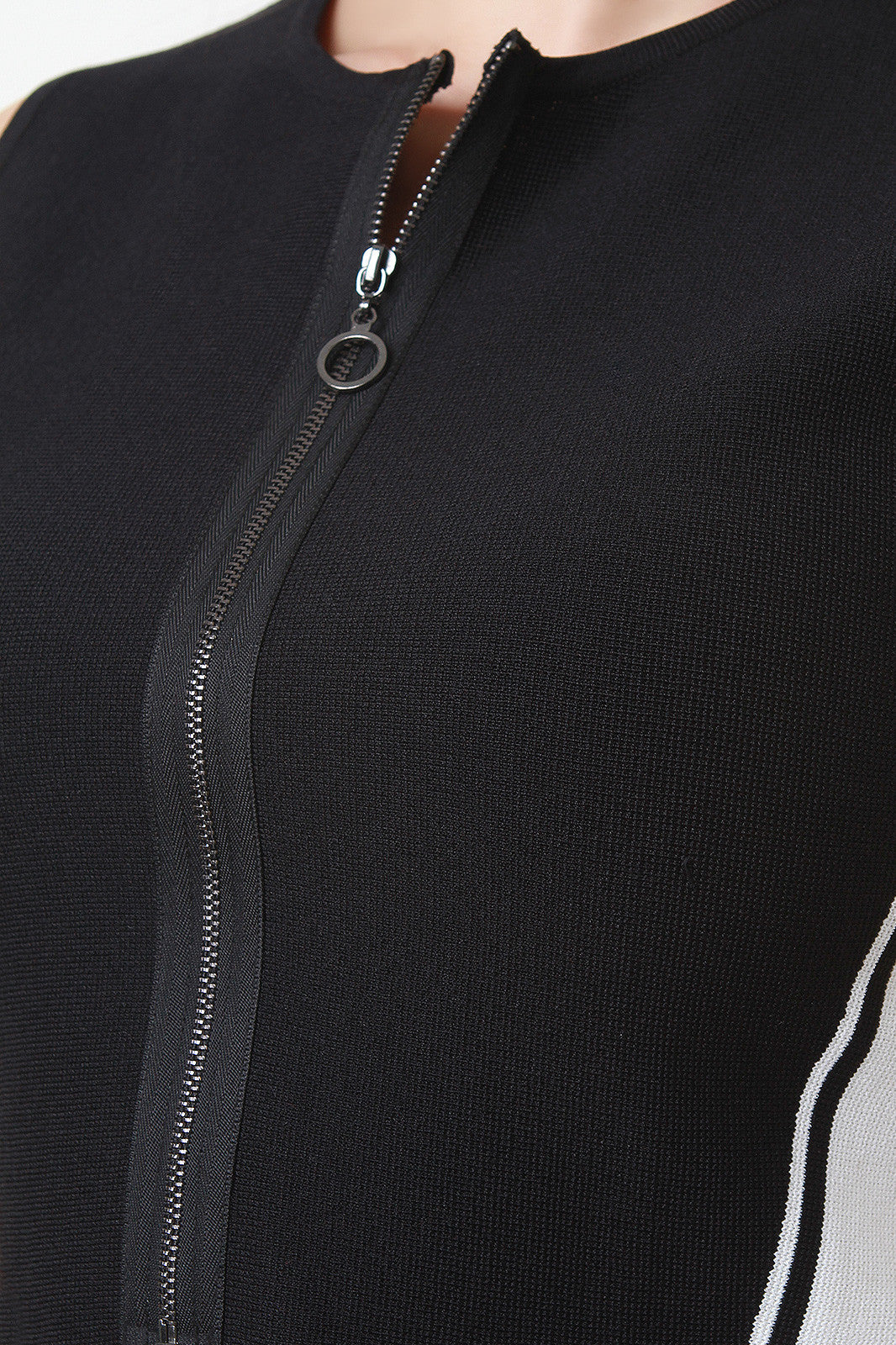 This sleeveless knitted top features an exposed zipper front, round neckline, and contrasting color block sides. Accessories sold separately. Made in U.S.A. 65% Rayon, 35% Nylon.