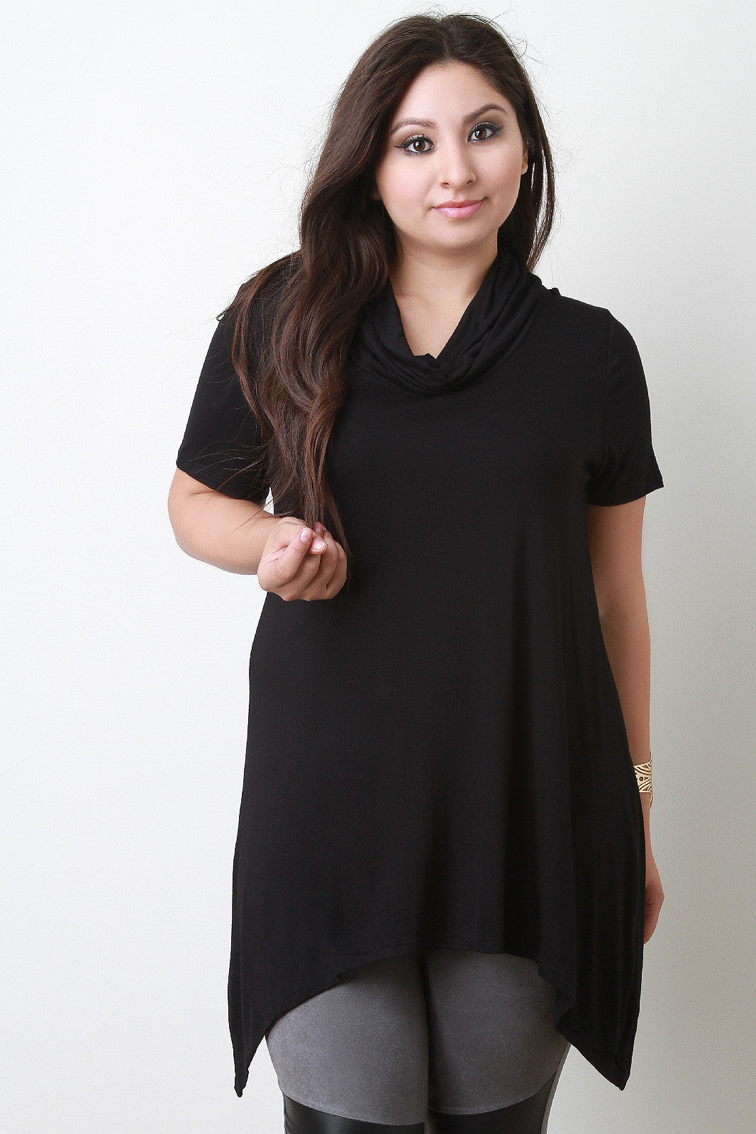 This casual plus size top features a turtleneck, short sleeves design, and finished with asymmetrical sharkbite hemline. Made in U.S.A. 95% Rayon, 5% Spandex.