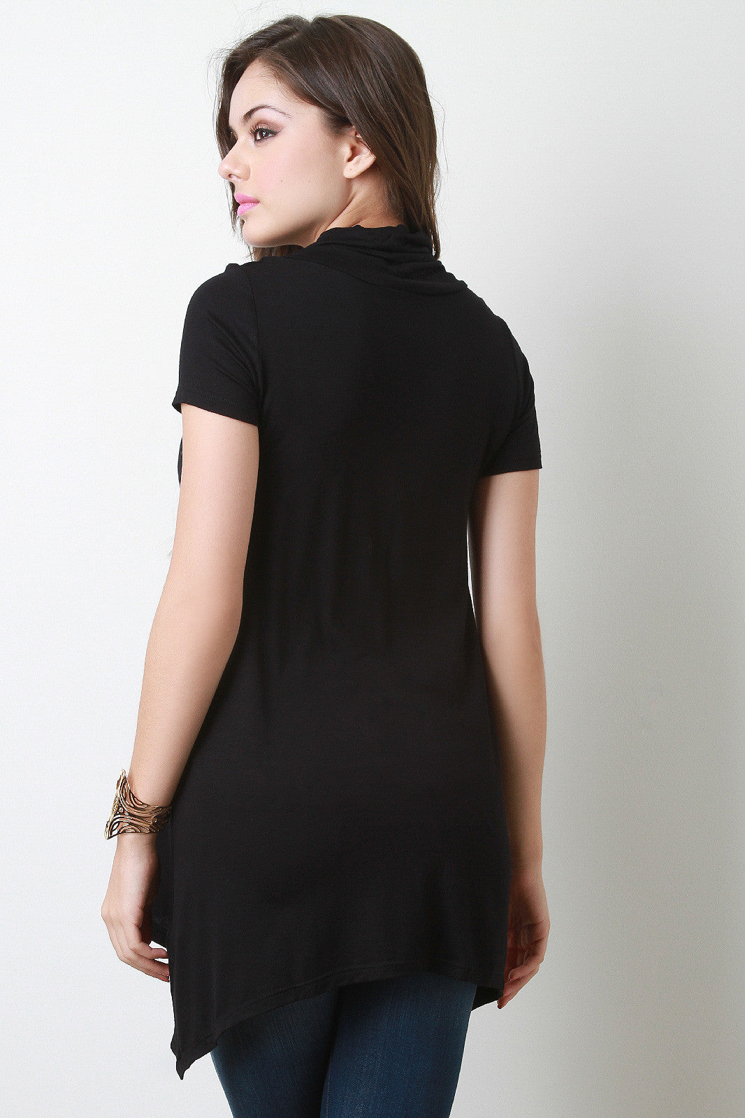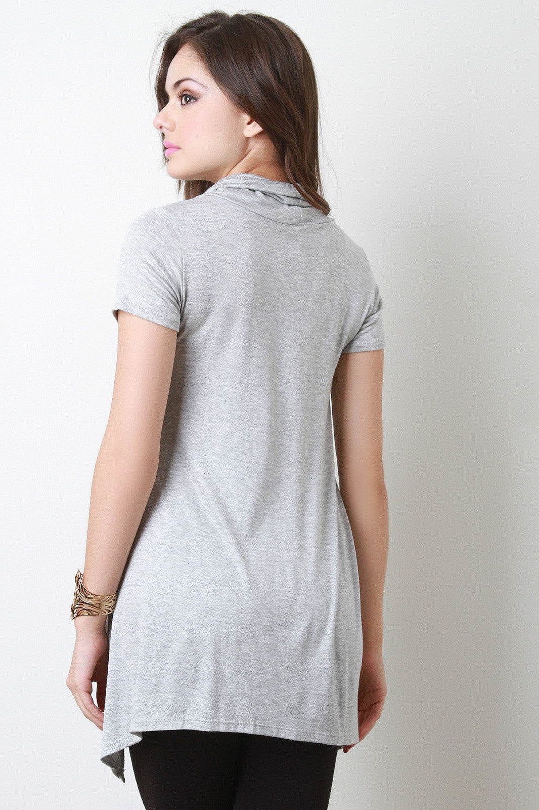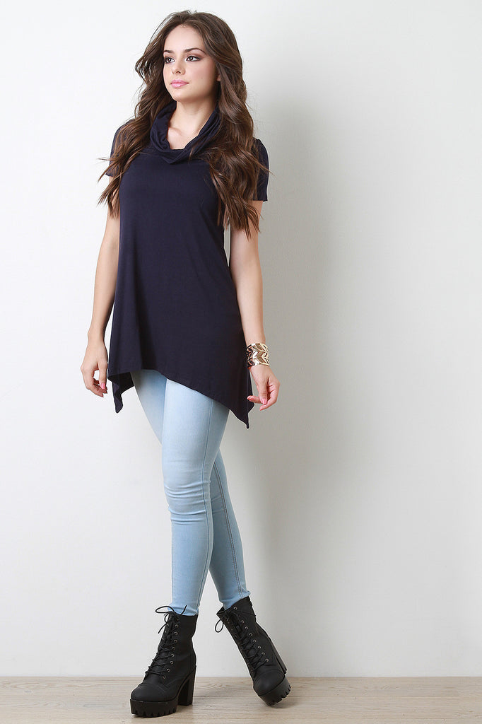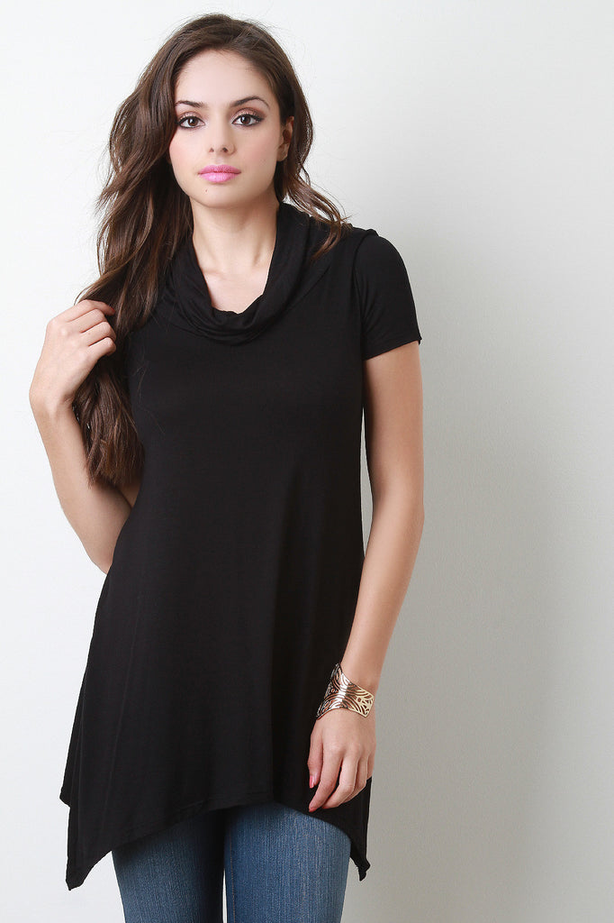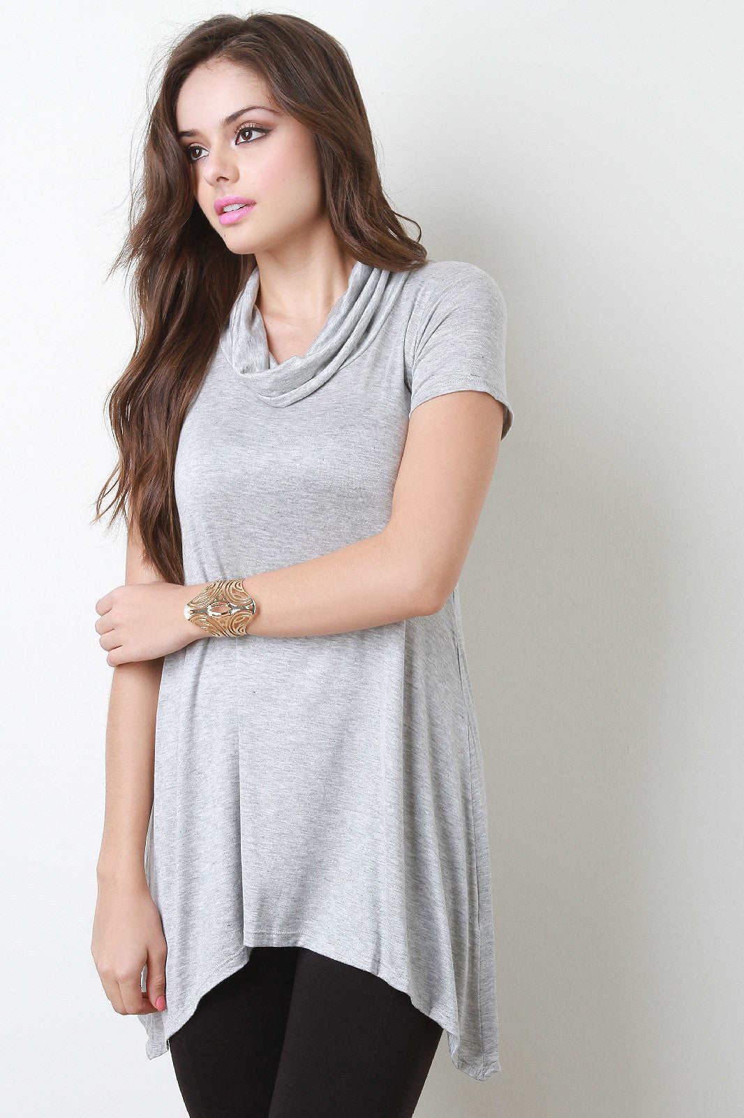 This lightweight jersey knit top features a cowl neckline, short sleeves, shift cut fit, and sharkbite hemline. Accessories sold separately. Made in U.S.A. 95% Rayon, 5% Spandex.