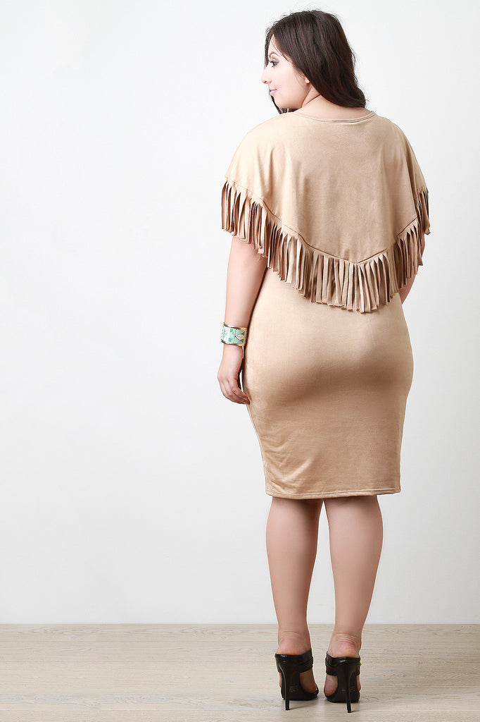 A plus size faux suede dress featuring a scooped round neckline, attached cape-like shawl with fringe trim, and midi-length skirt. Accessories sold separately. Made in U.S.A. 95% Polyester, 5% Spandex.