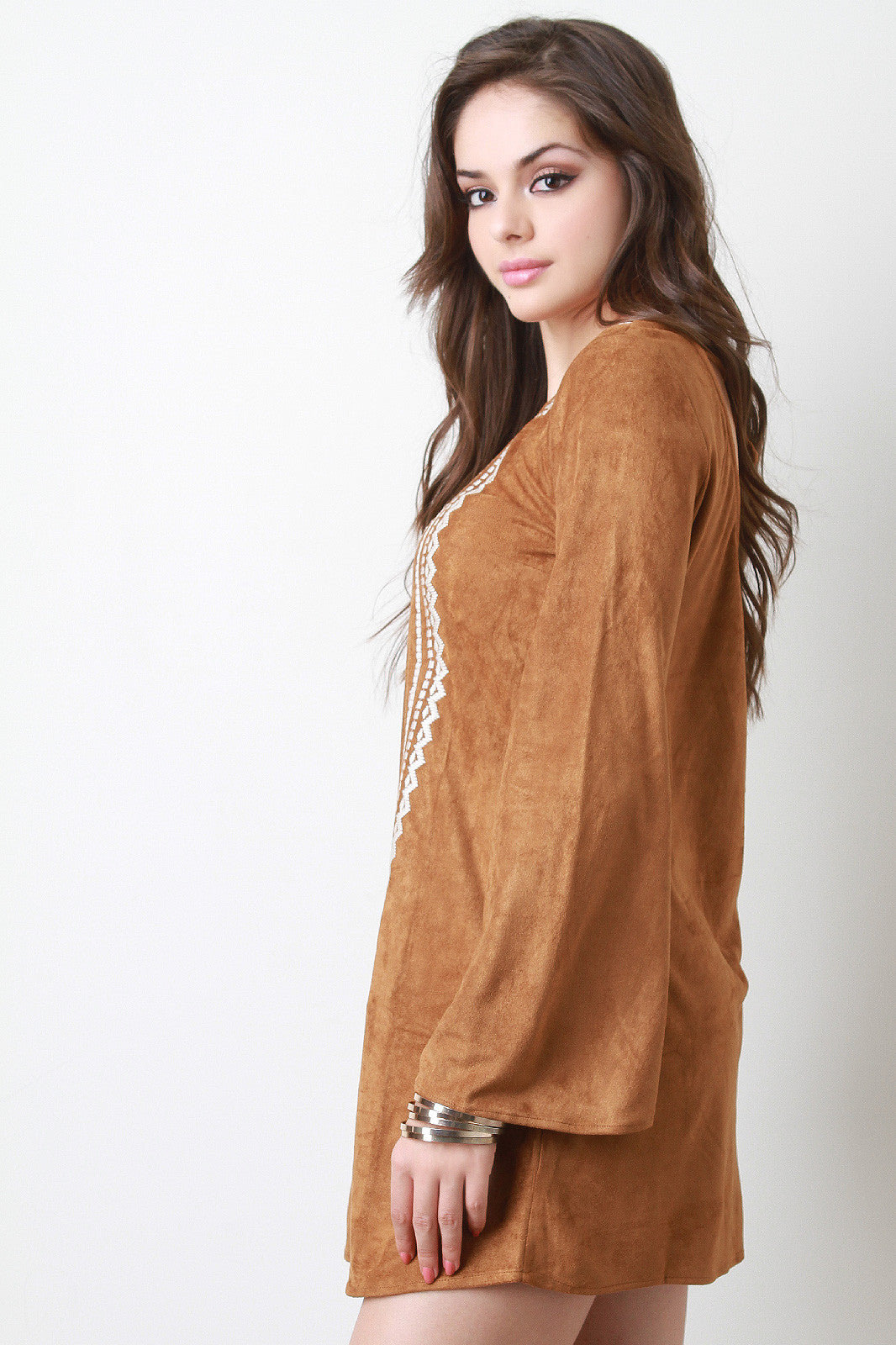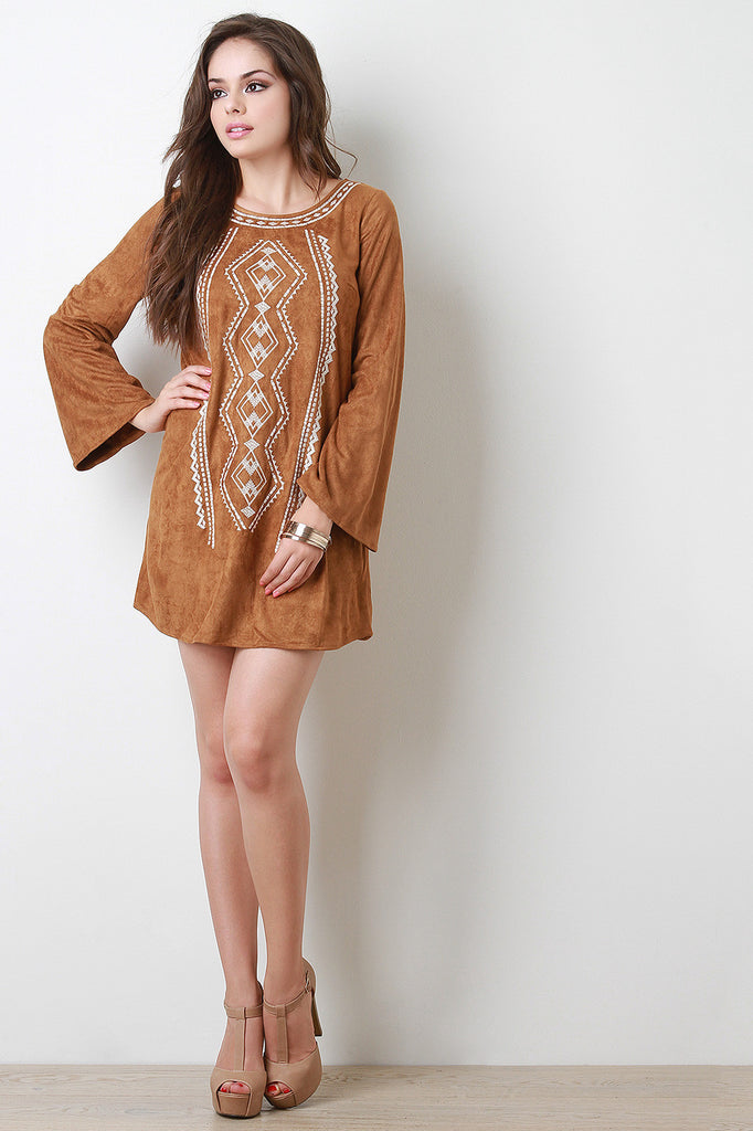 This boho-chic shift dress features a round neckline, faux suede fabrication with embroidered detail front, long bell sleeves, scooped back with self-tie strap detail, and slightly curved hemline. Accessories sold separately. 100% Polyester.