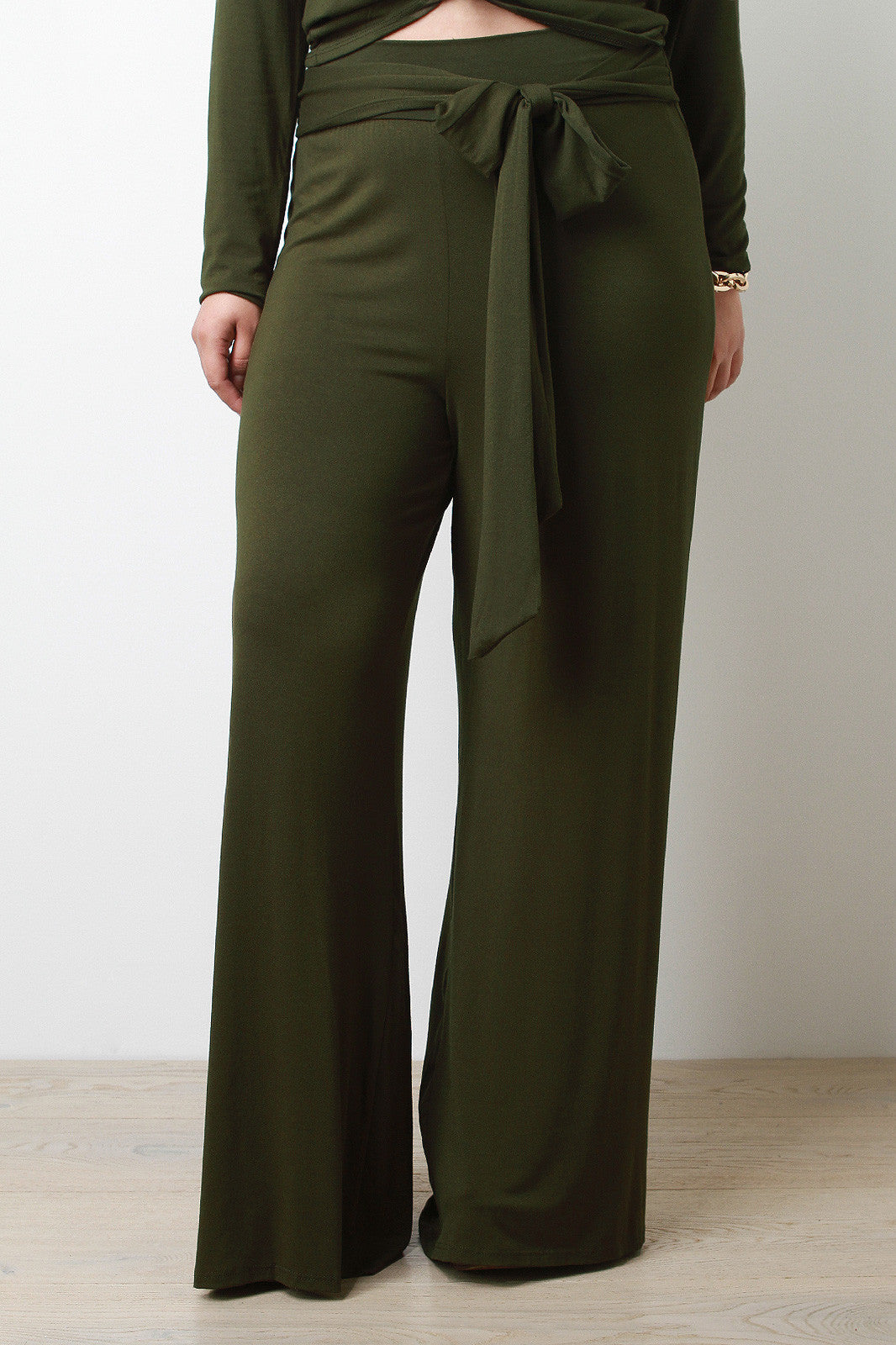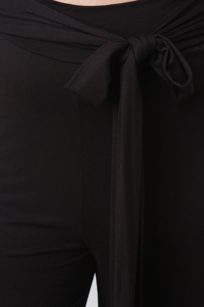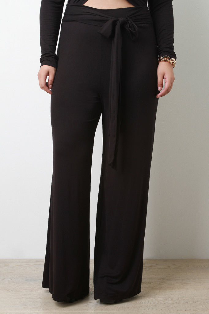 Plus size pants featuring jersey knit, wide legs, and a self-tie sash at the front. Unlined. Accessories sold separately. Made in U.S.A. 95% Rayon, 5% Spandex.