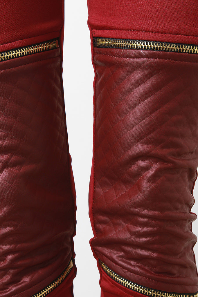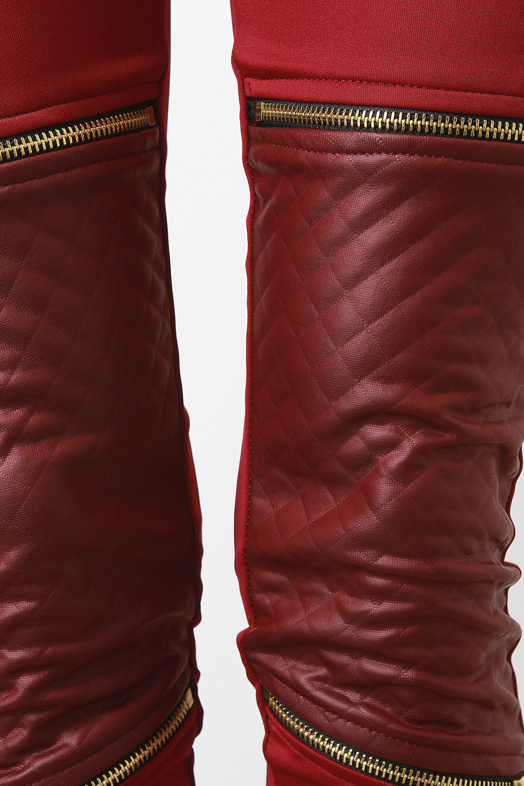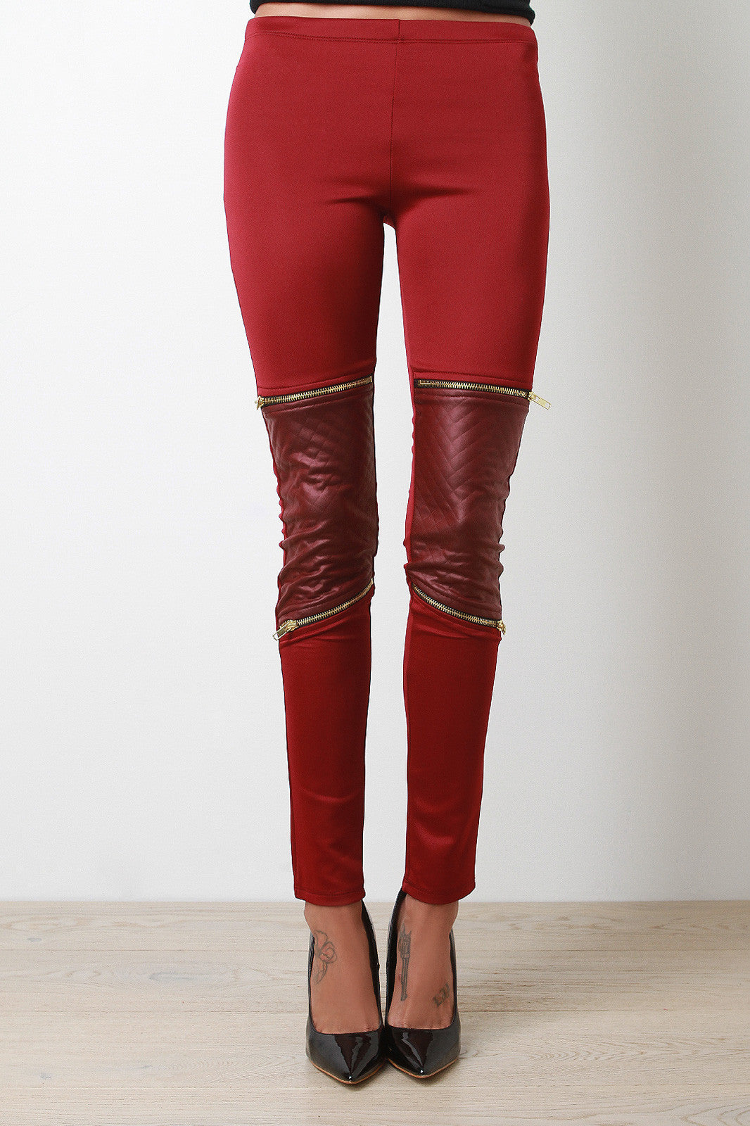 These leggings feature smooth stretch fabric, elasticized waist, quilted vegan leather panels with zipper decor, and taper cut. Accessories sold separately. Made in U.S.A. 92% Polyester, 8% Spandex.