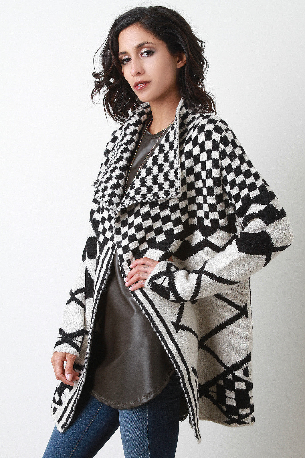 This plush cardigan features contrasting checker pattern design, open front to a flap collar neckline, and long sleeves. Accessory sold separately. 80% Acrylic, 20% Wool.