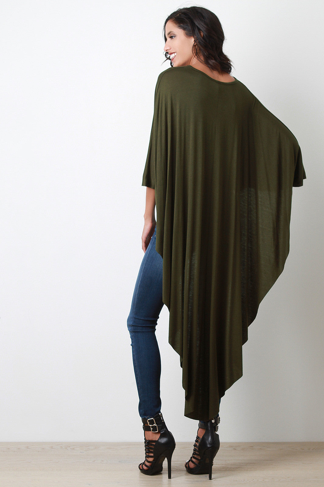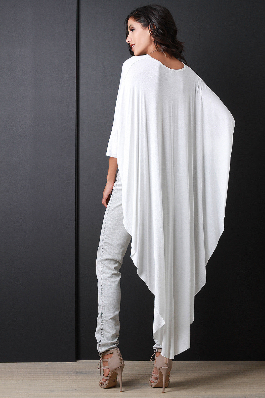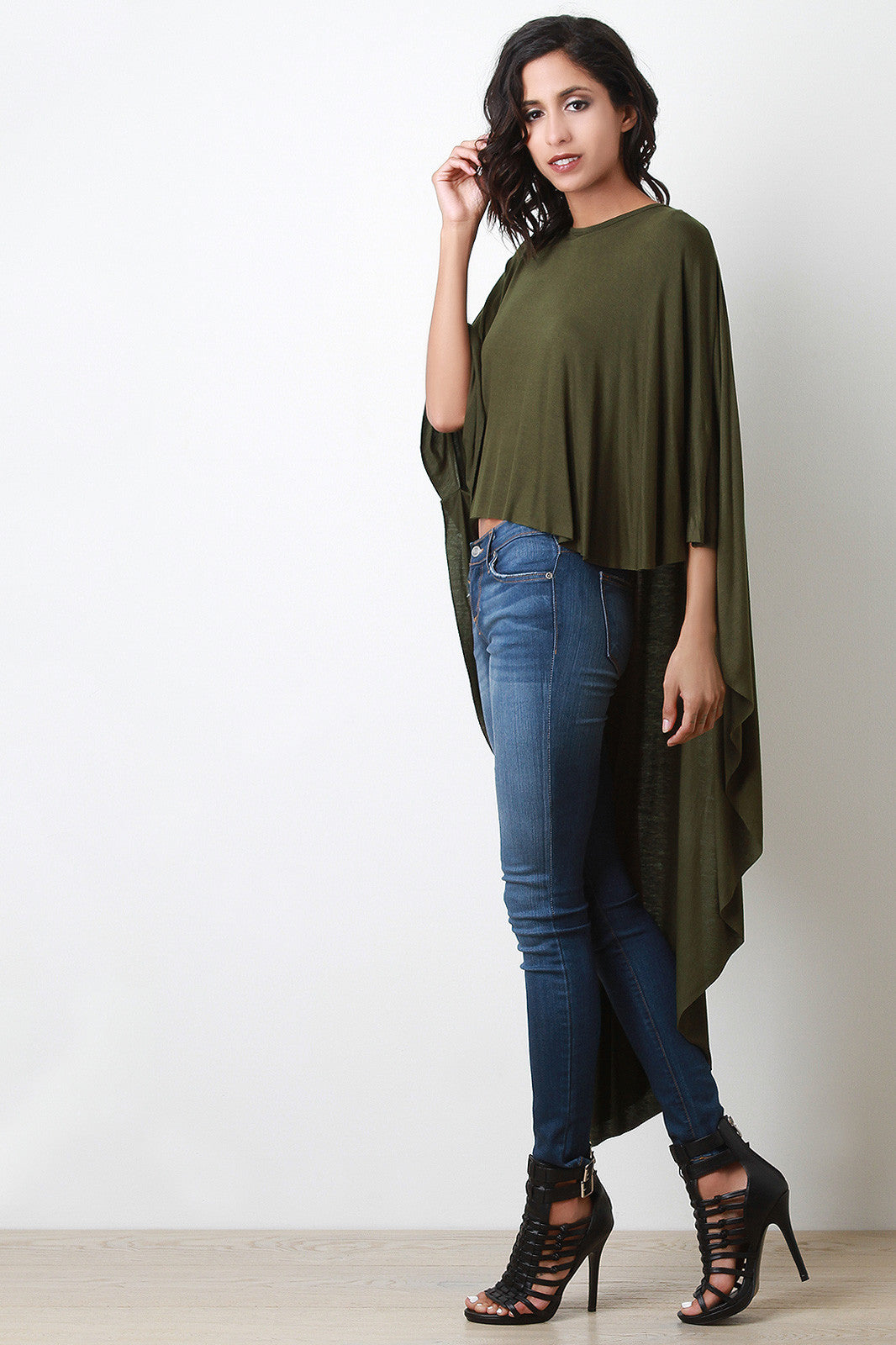 This cape top features soft jersey knit, round neckline, dolman sleeves, and finished with high-low hem. Accessories sold separately. Made in U.S.A. 96% Rayon, 4% Spandex.