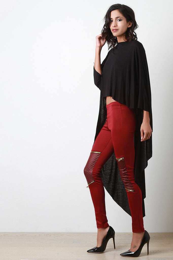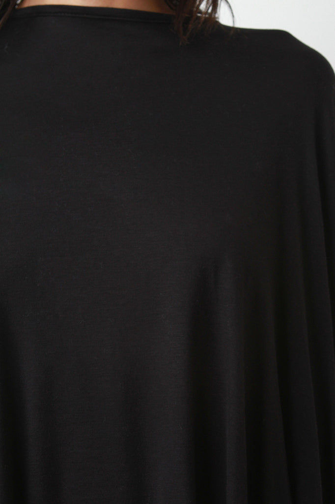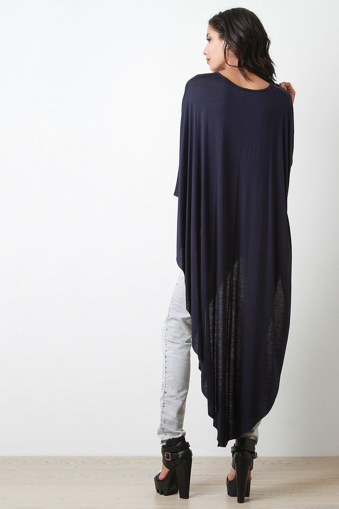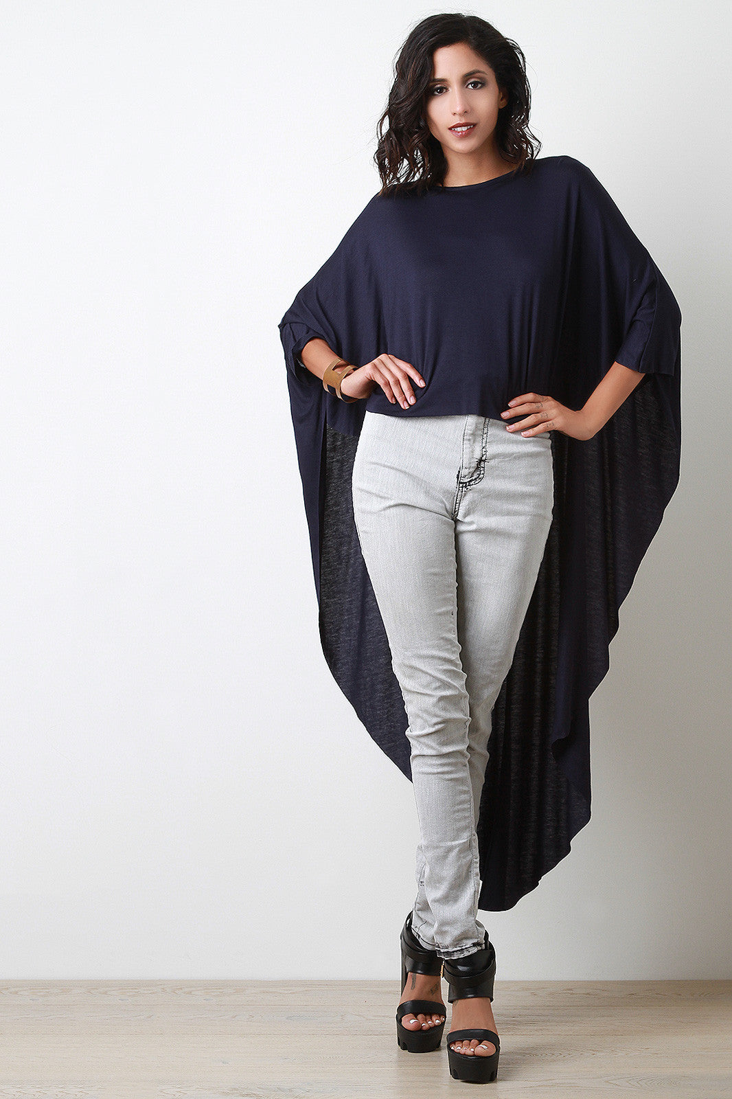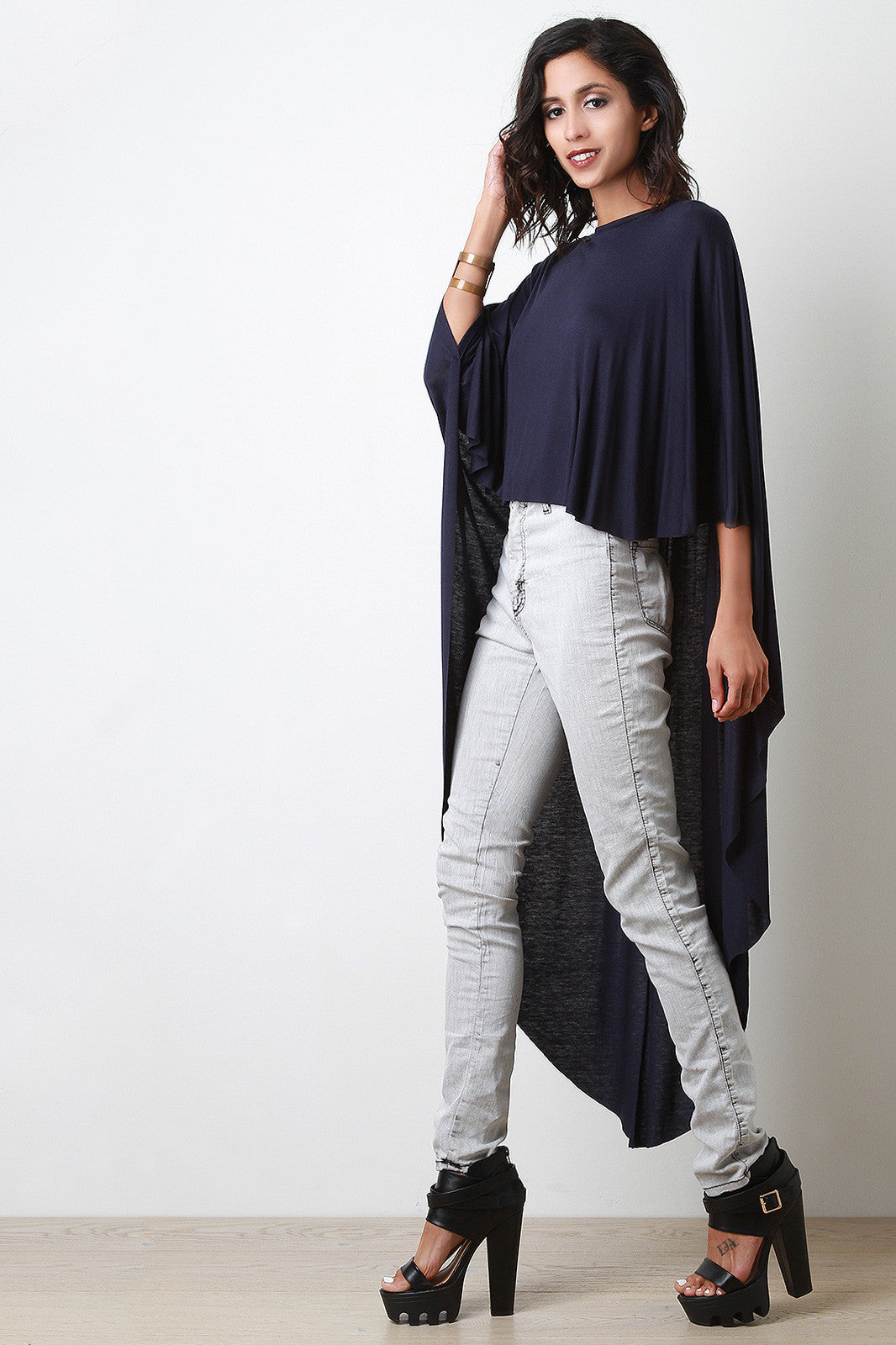 This cape top features soft jersey knit, round neckline, dolman sleeves, and finished with high-low hem. Accessories sold separately. Made in U.S.A. 96% Rayon, 4% Spandex.