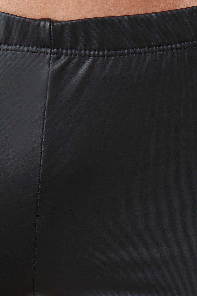 These trendy pants feature vegan leather, elasticized waist, and flared bottoms. Accessories sold separately. Made in U.S.A. 100% Rayon.