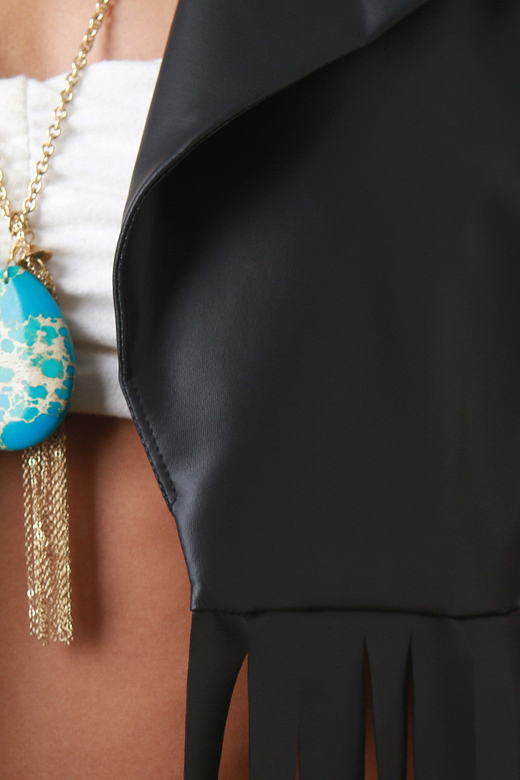 This vest features vegan leather, open front, pointed lapels, and midi length fringe hem. Accessories sold separately. Made in U.S.A. 100% Rayon.