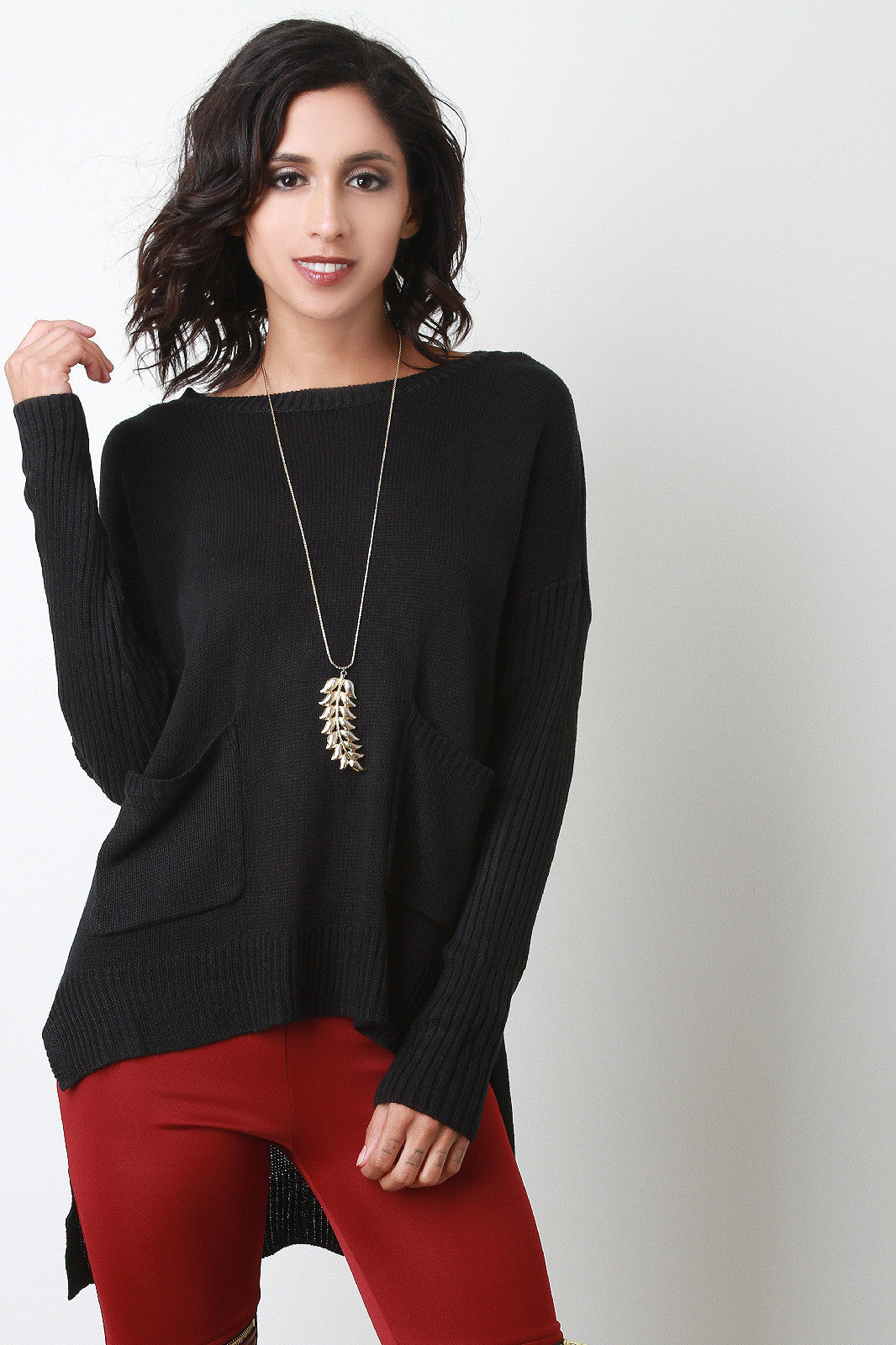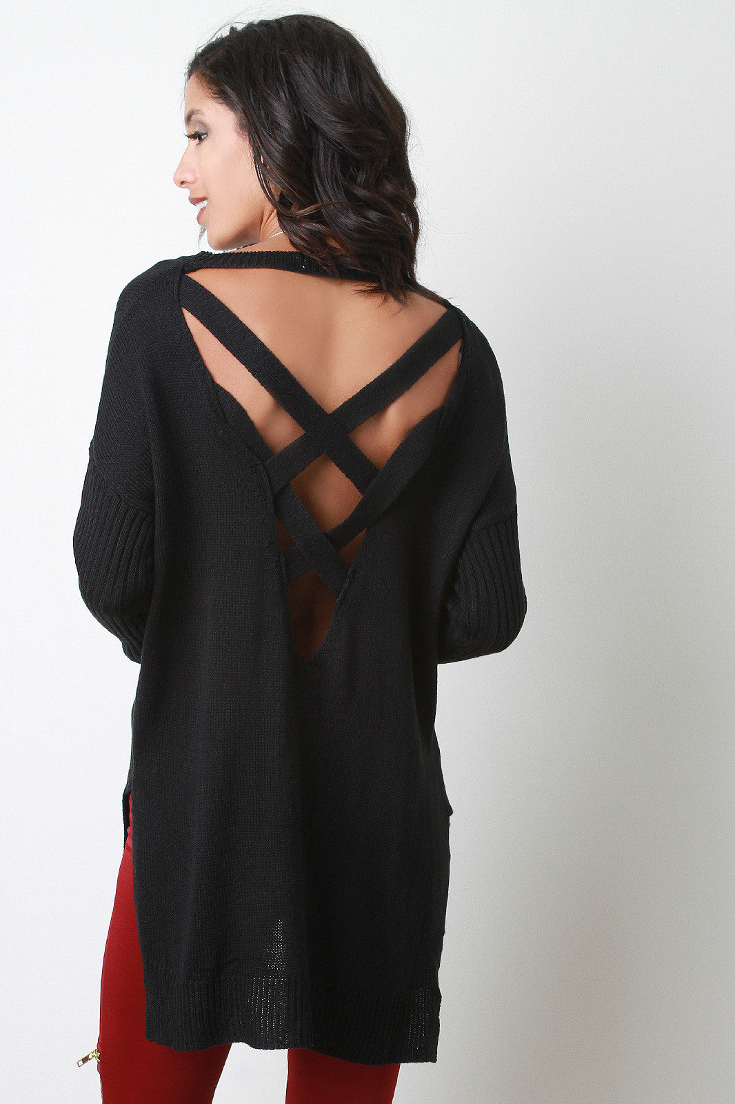 This knitted sweater top features a backless cutout with crisscross cage design, round neckline, long ribbed knit sleeves, square front pockets, vent slits sides, and high low hemline. Accessory sold separately. 100% Acrylic.