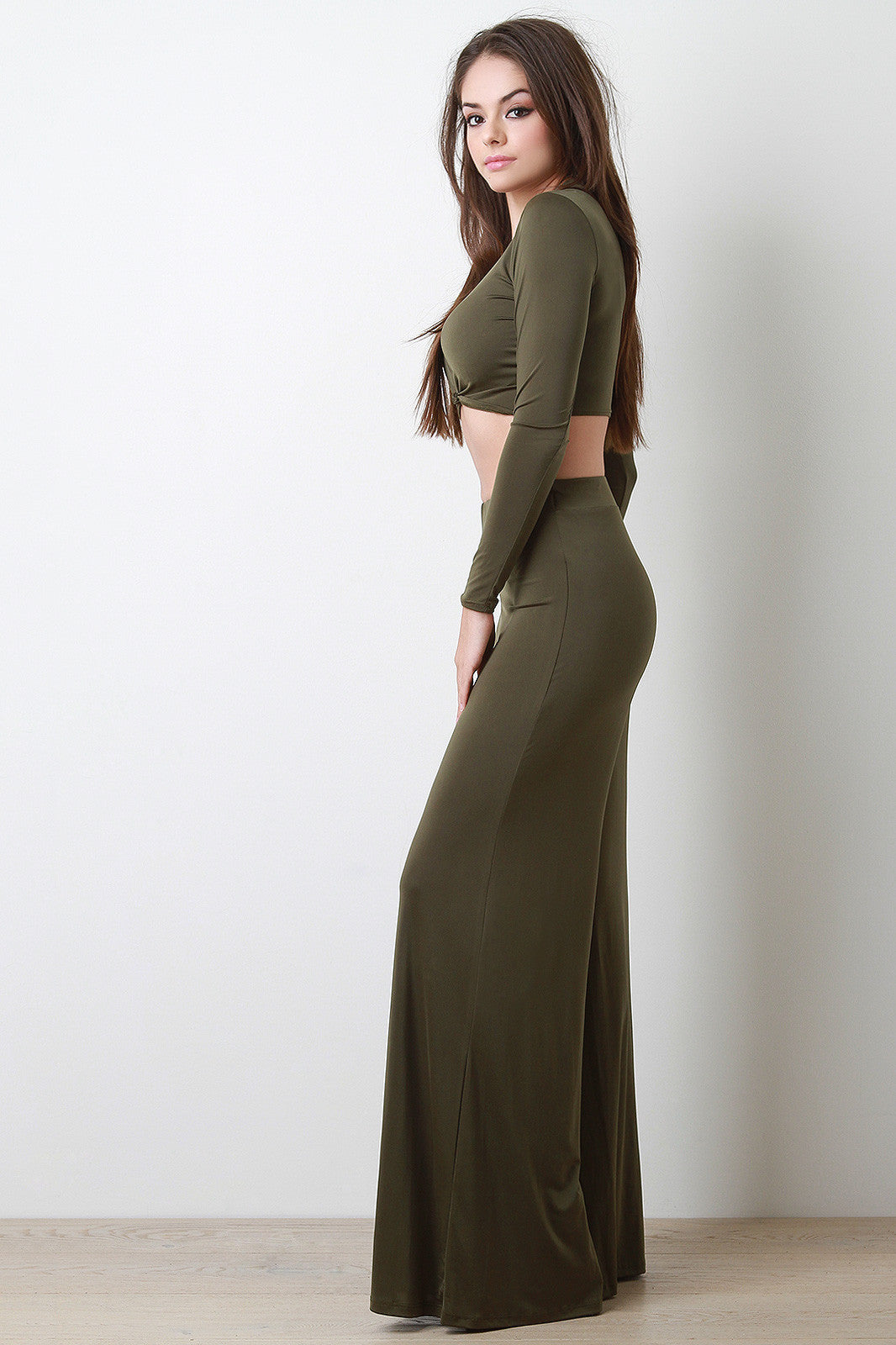 This crop top features a smooth stretch fabric with a slight sheen, round neckline, and long sleeves. Finished with a knot embellishment at the front hem. Accessories sold separately. Made in U.S.A. 95% Polyester, 5% Spandex.