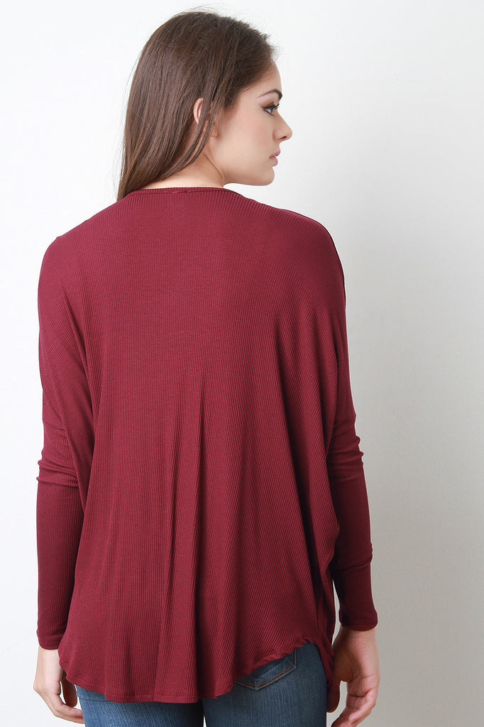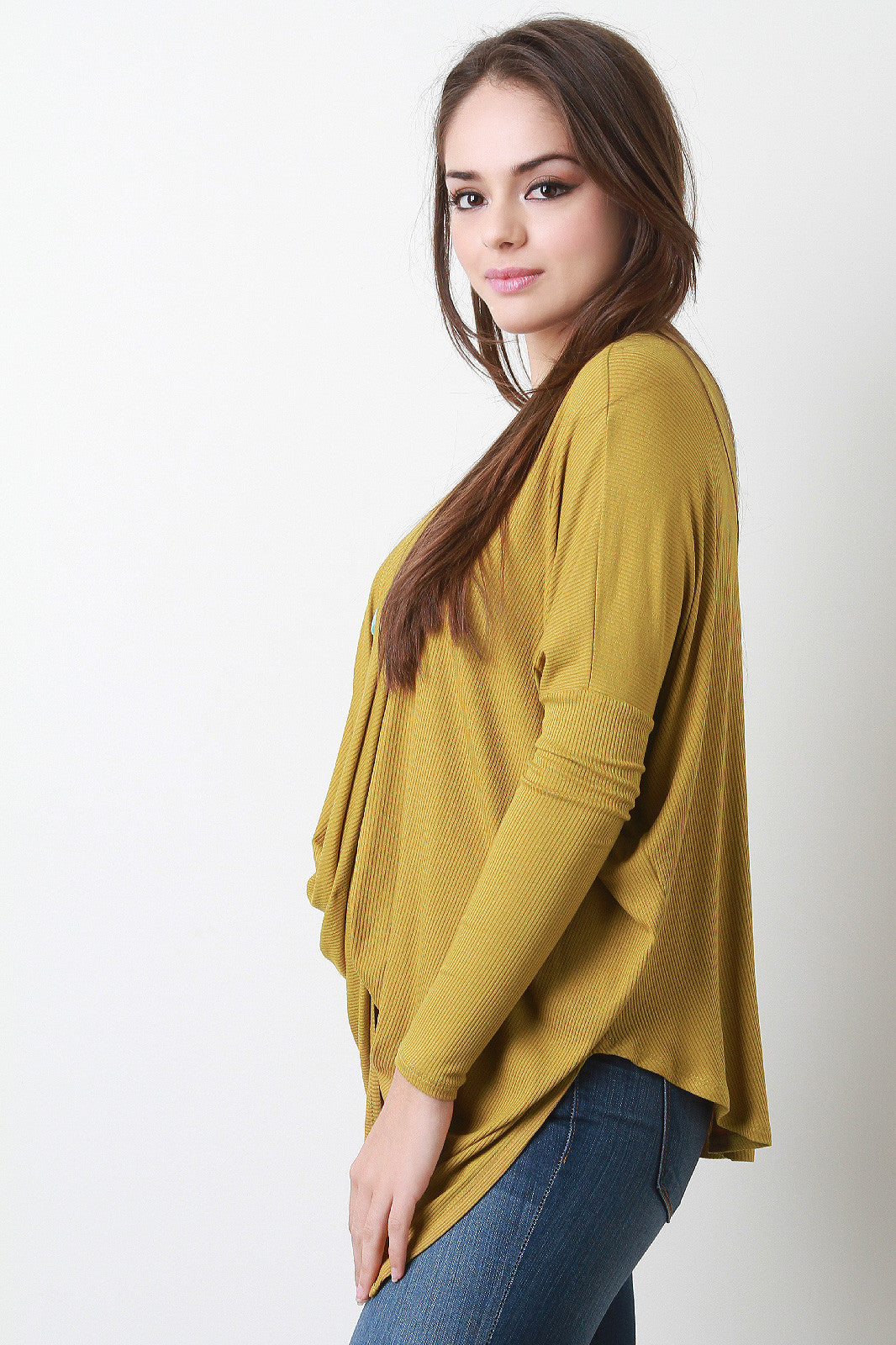 This ribbed knit top features a plunging twisted constructed front, long sleeves, and an asymmetrical hemline. Accessories sold separately. Made in U.S.A. 95% Rayon, 5% Spandex.