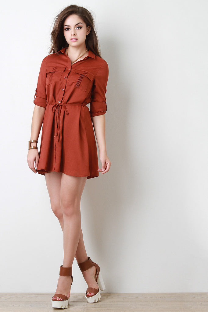 This mini shirt dress features a classic collar neckline, button-up front, double flap breast pockets with pinched stitched details, long sleeves with button-tab cuff option, and a cinched self-tie waist. Accessories sold separately. 100% Polyester.