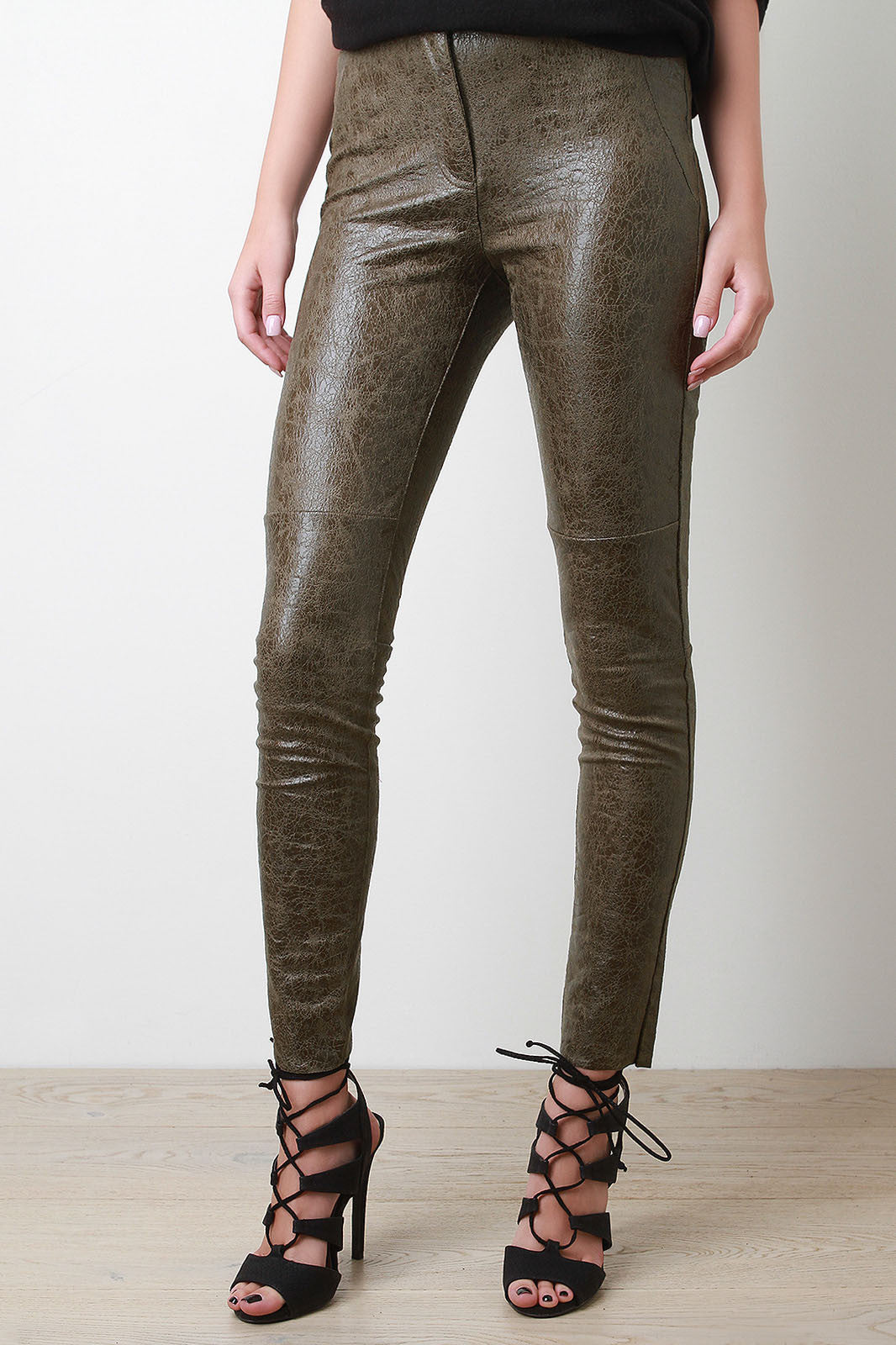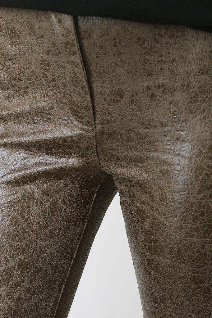 Fitted faux leather , sectioned design, and zipper and button fly. Accessories sold separately. 95% Polyester, 5% Spandex.
