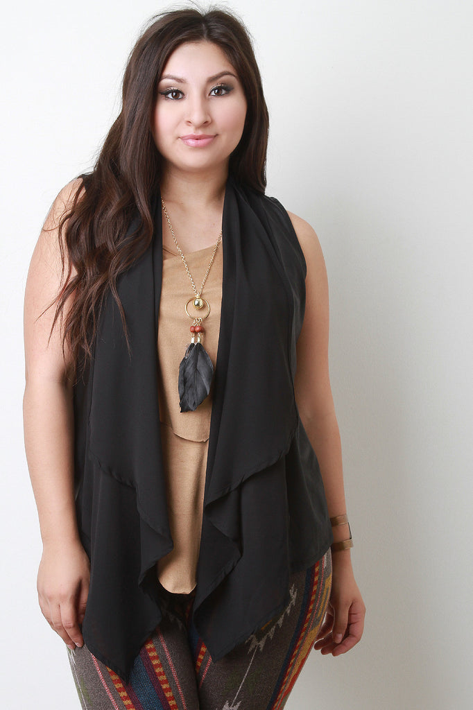 This plus size sleeveless vest features vegan leather back, semi-sheer chiffon front, waterfall open front, and an asymmetrical hemline. Accessories sold separately. Made in U.S.A. 96% Polyester, 4% Spandex. Contrast: 100% Polyester.