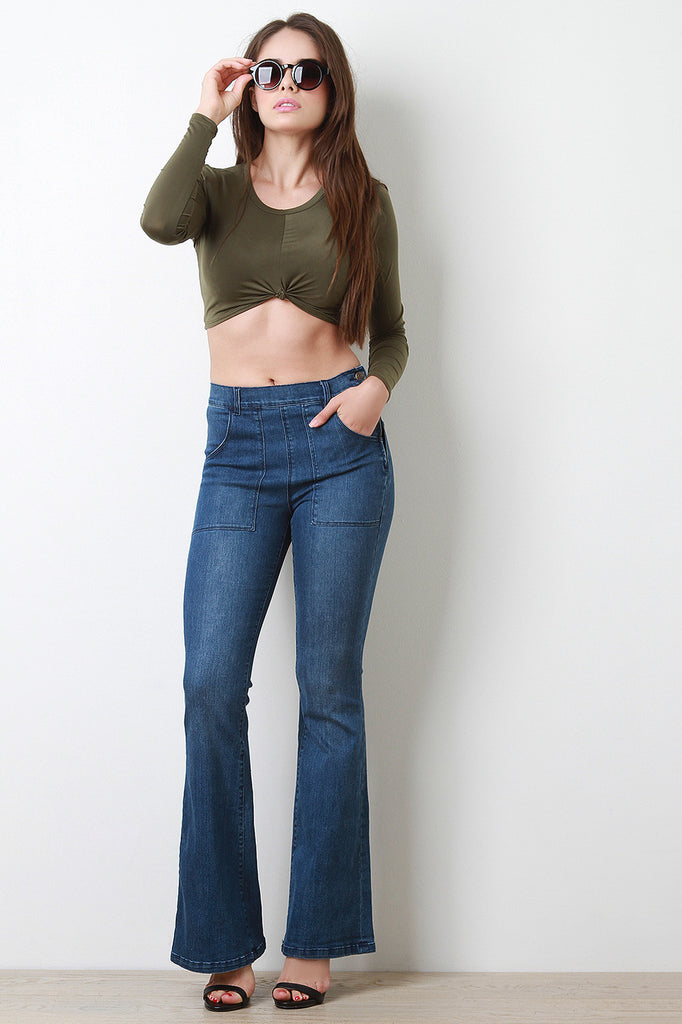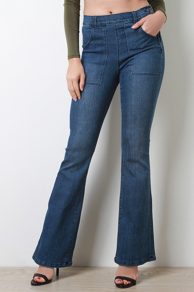 These bell bottom denim jeans features a high rise waist, side zipper fastener to a single button closure, belt loops, rectangular pockets, rear pockets, and flare cut fit. Accessories sold separately. 98% Cotton, 2% Spandex.