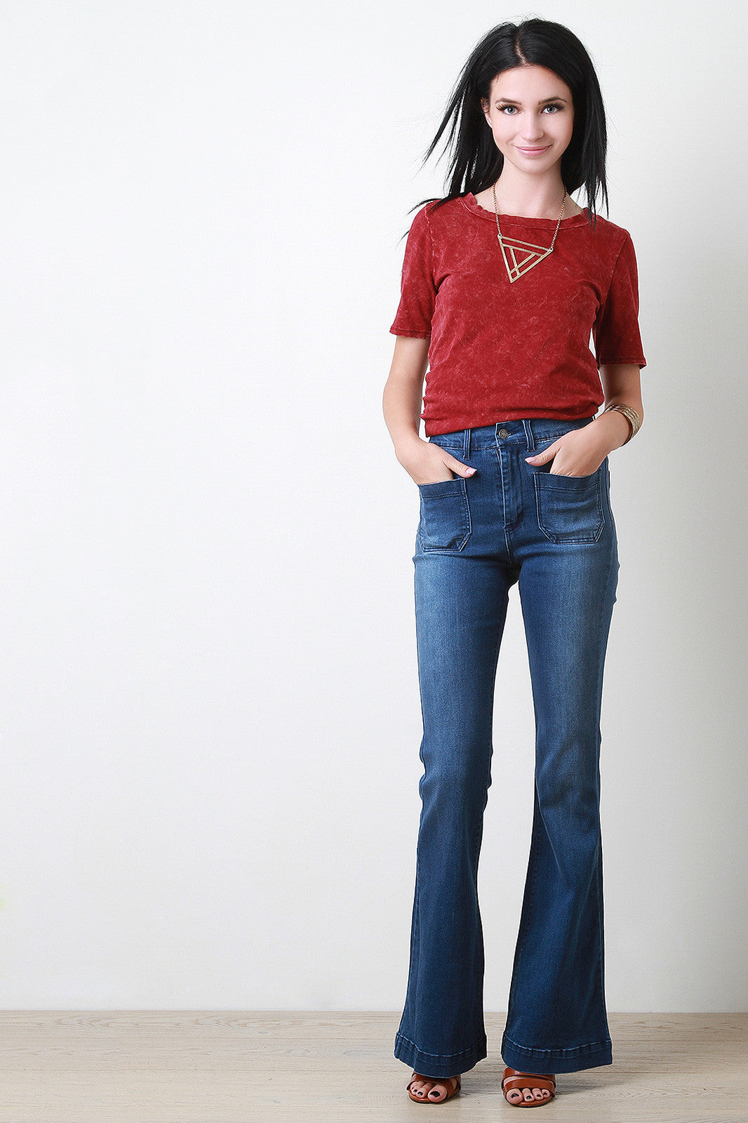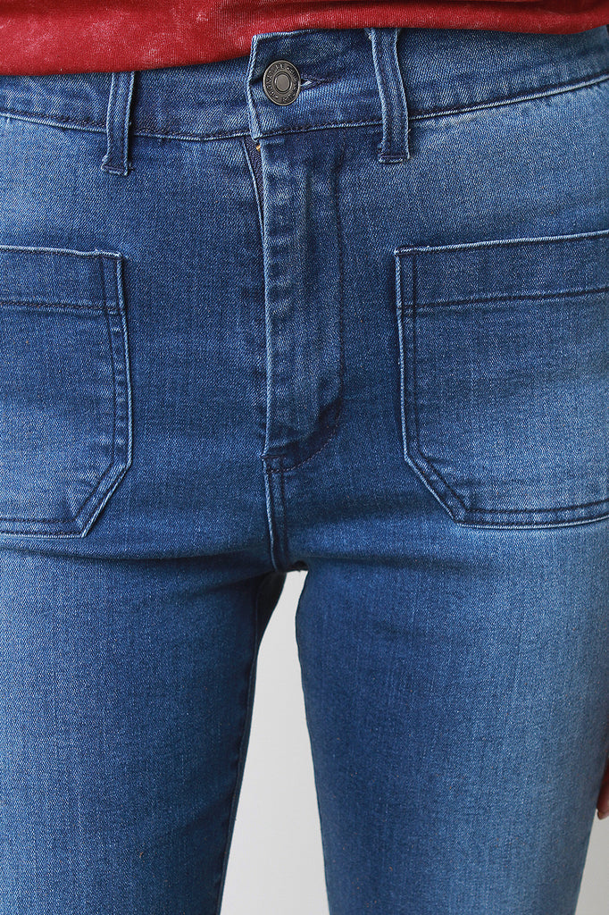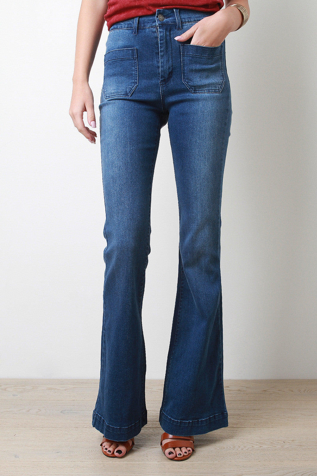 These denim jeans features a high rise waist, belt loops, zipper fly, single button closure, four pockets construction, flare bell bottom and wide hemline seam. Accessories sold separately. 70% Cotton, 28% Polyester, 2% Spandex.
