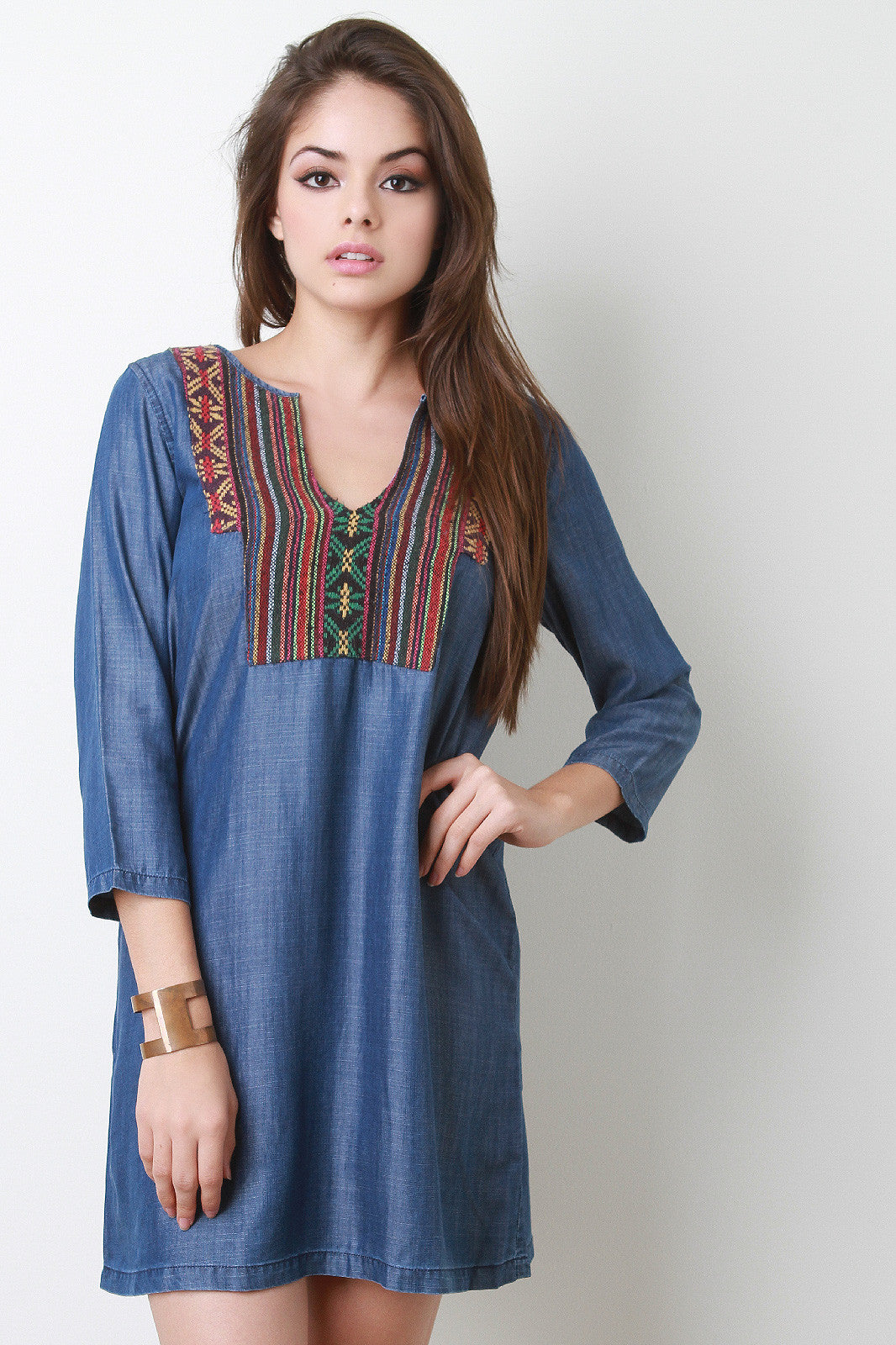This chambray dress features a v-neckline, Aztec embroidery yoke, quarter-length sleeves, and shift cut fit. Accessories sold separately. 100% Tencel. Contrast: 50% Cotton, 50% Polyester.