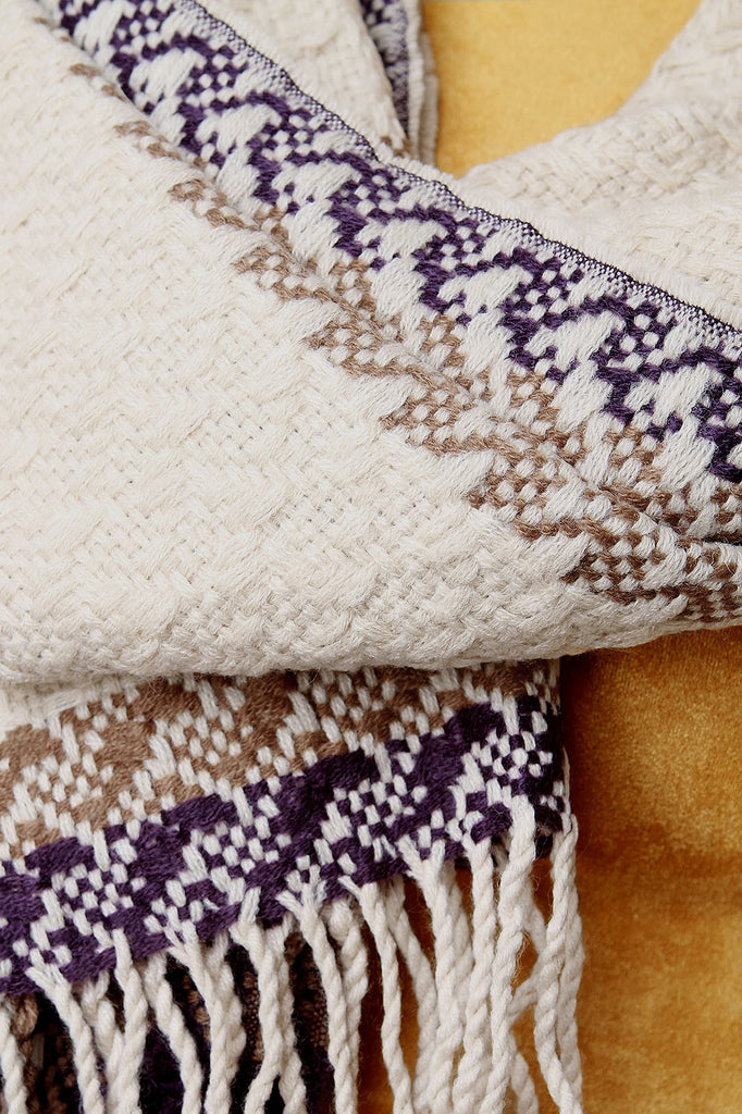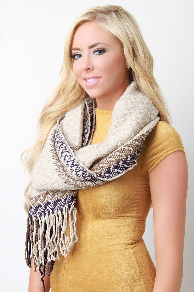 A wide scarf featuring a woven texture, stripe design along all four edges, and fringed ends. 100% Acrylic.
