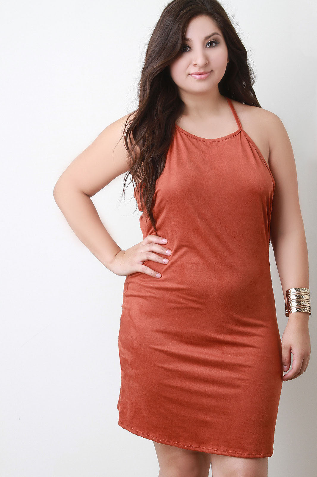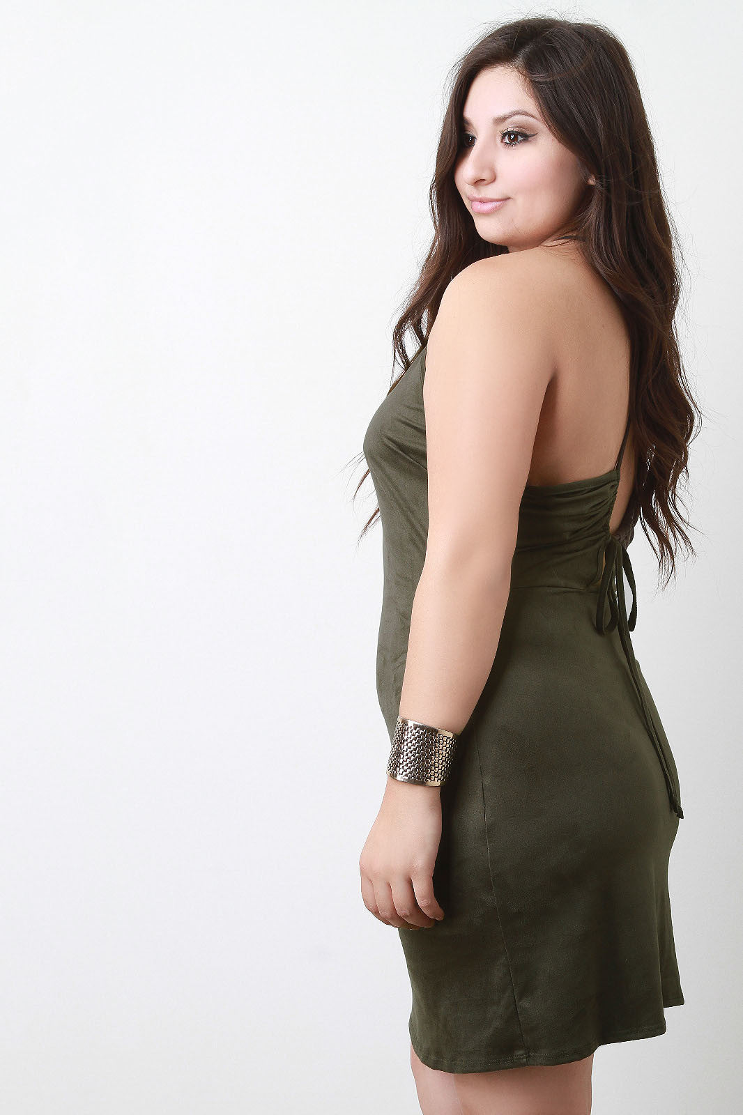 A plus size mini dress featuring faux suede fabric, a straight neckline, and thin shoulder straps that cross at the back to create a drawstring keyhole design with self-tie bow. Accessories sold separately. Made in U.S.A. 90% Polyester, 10% Spandex.