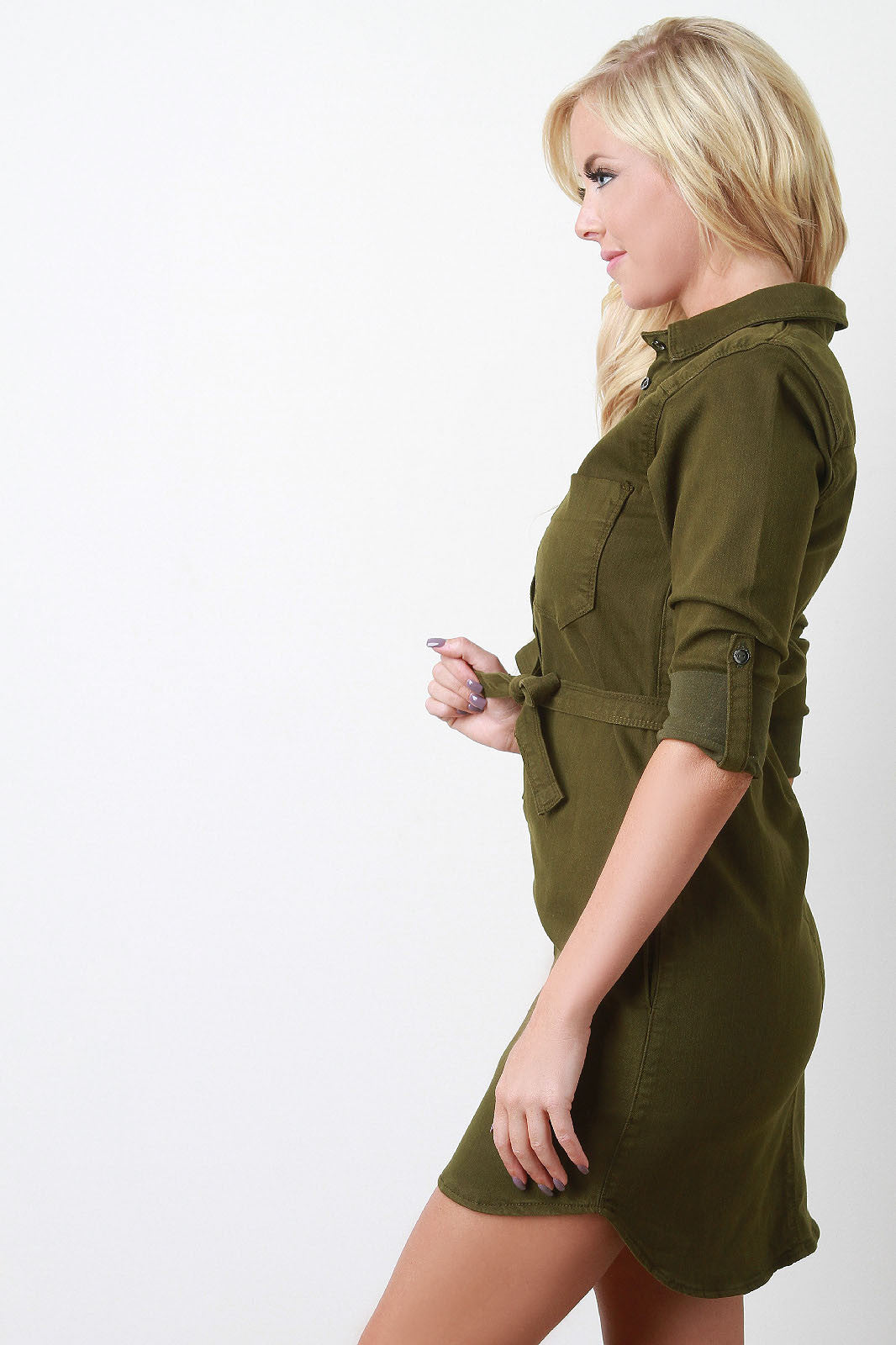 A mini dress featuring a shirt collar, button-up front with glossy buttons, and cuffed half sleeves with buttoned strap accent. Finished with left breast pocket, self-tie bow belt, and side pockets. Accessories sold separately. Made in U.S.A. 42% Lyocell, 32% Cotton, 15% Rayon, 8% Polyester, 3% Spandex.