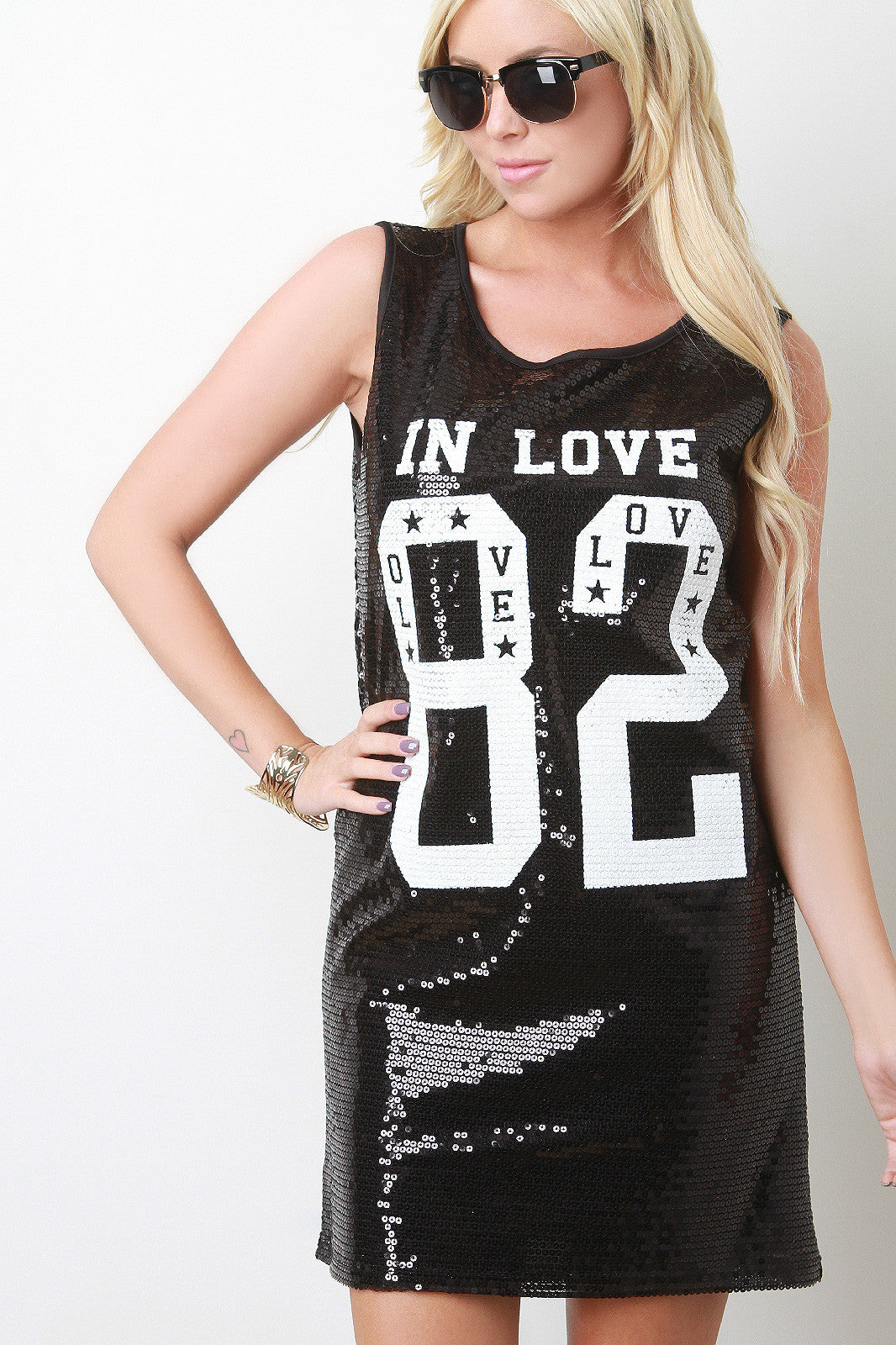 This tunic dress features a round neckline, sleeveless design, sequins embellished design with the word "IN LOVE 82" at front, and fully lined. Accessories sold separately. Made in U.S.A. 100% Polyester.