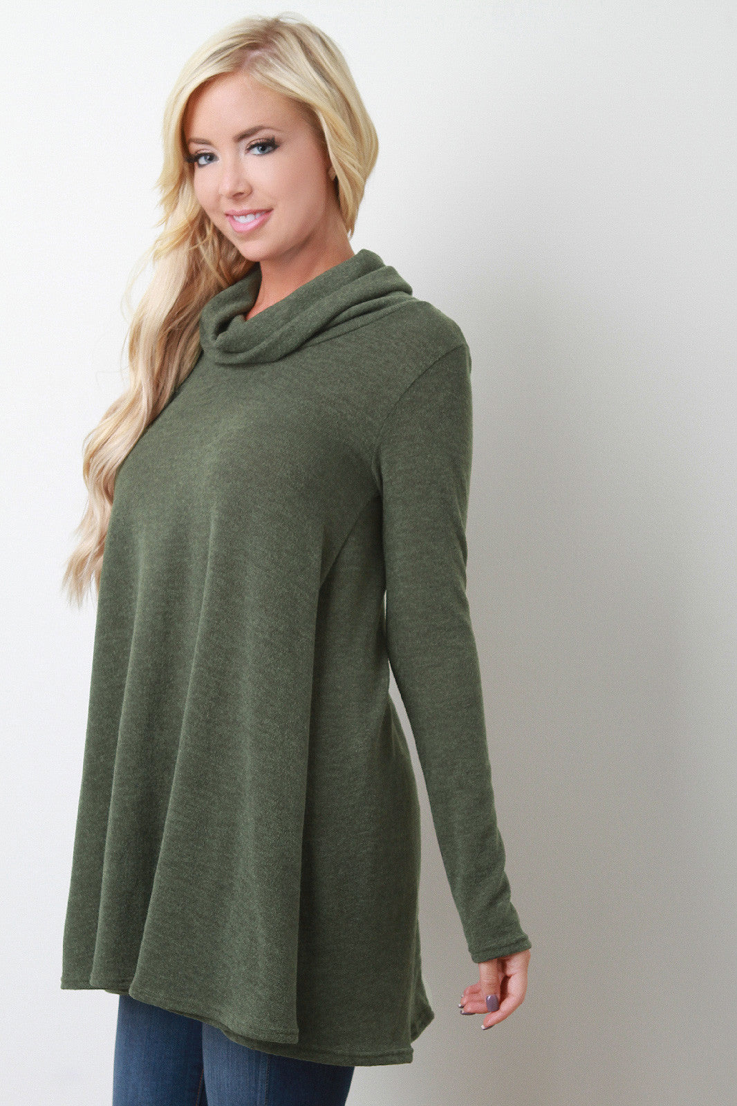 This sweater top features a cowl neck, long sleeves design, back buttons accent, and finished with curved hemline. Accessories sold separately. Made in U.S.A. 96% Polyester, 4% Spandex.