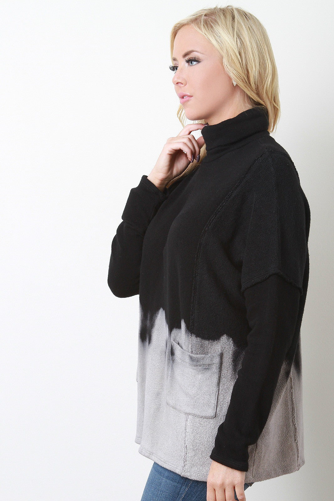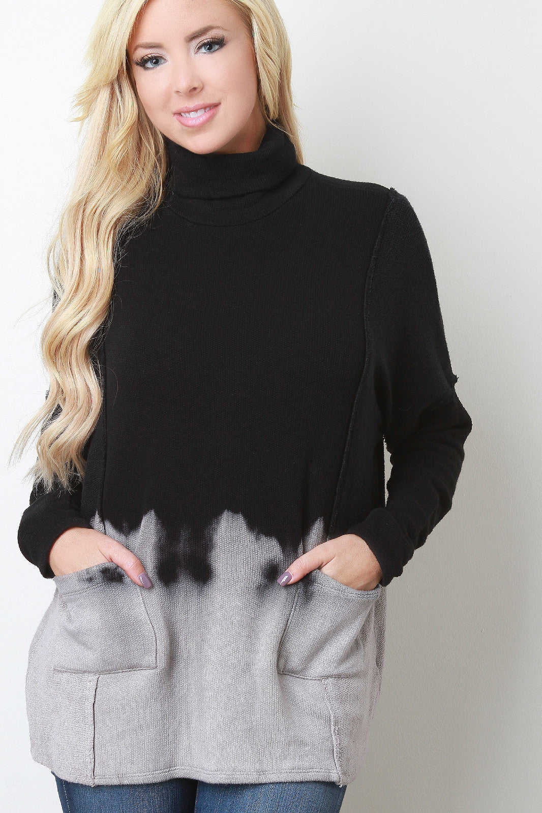 This cozy tie dye knit fabrication, turtleneck, two front pockets, long sleeves, and raw edge detailing. Accessories sold separately. Made in U.S.A. 49% Cotton, 48% Rayon, 3% Spandex.