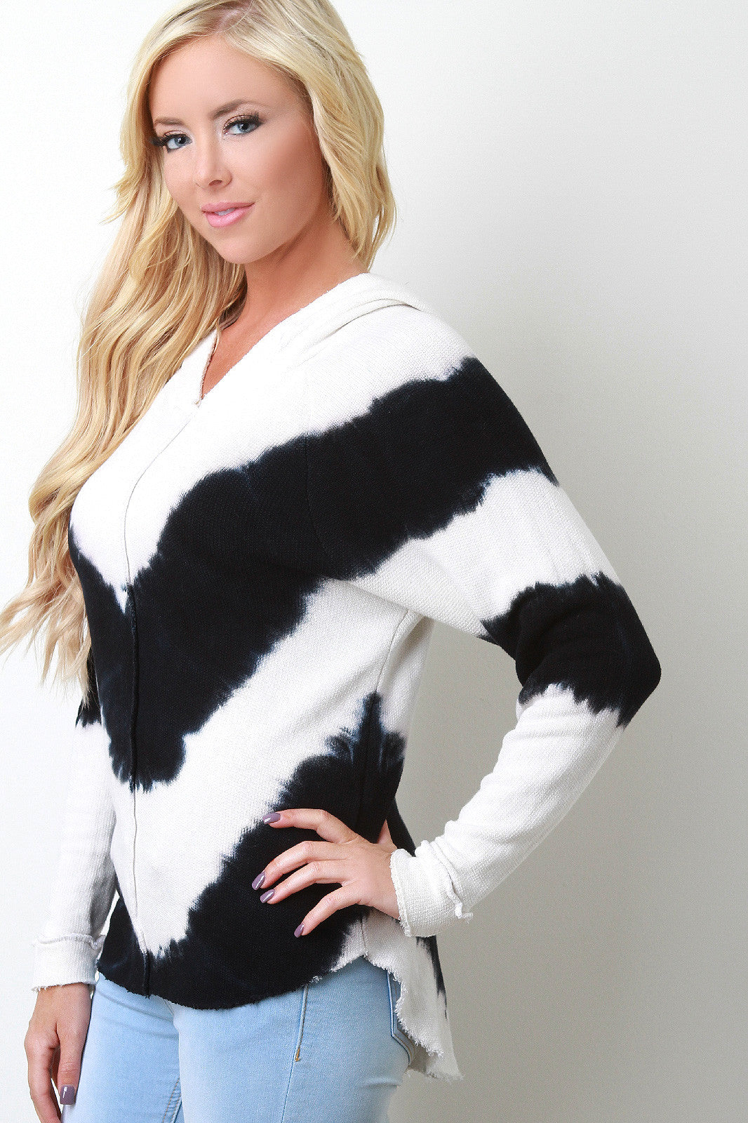 This warm long sleeves tie dye knit fabrication, attached hoodie, and finished with raw high low hemline. Accessories sold separately. Made in U.S.A. 49% Cotton, 48% Rayon, 3% Spandex.