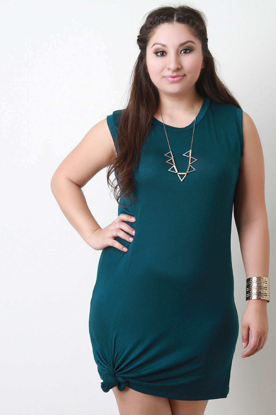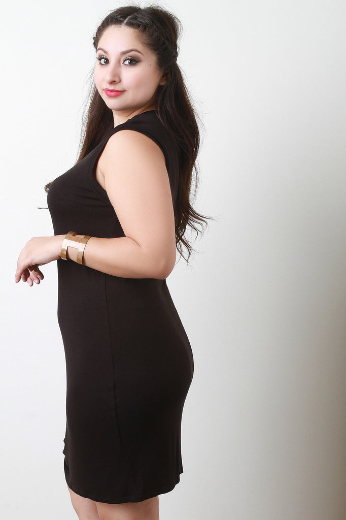 This plus size bodycon mini dress features a round neckline, sleeveless construction, and knotted detail hemline. Accessories sold separately. Made in U.S.A. 95% Rayon, 5% spandex.