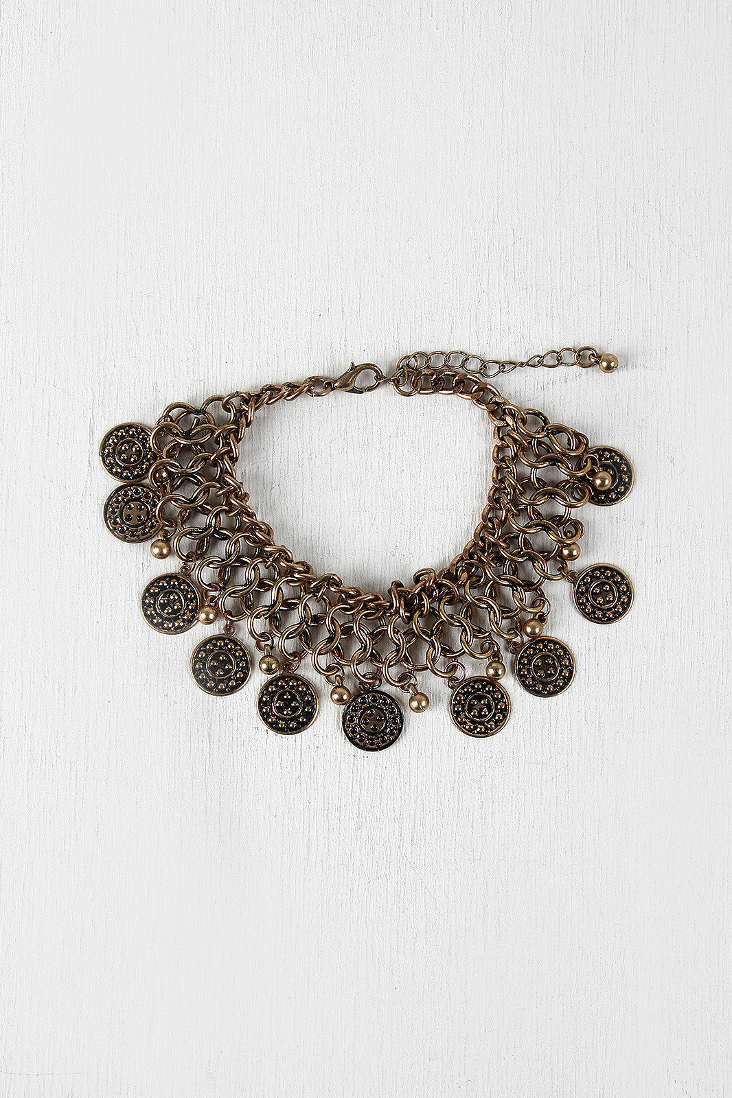A chain mail bracelet featuring lightweight coin charms, an antique finish, and adjustable lobster hook closure.