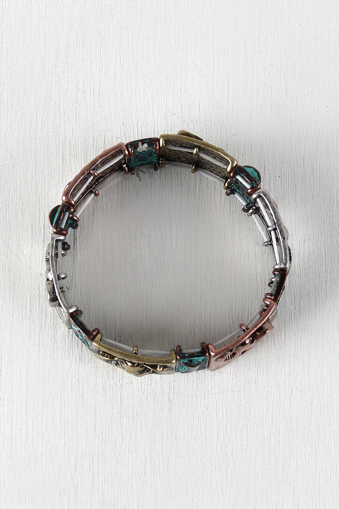 This elastic tile bracelet features different colors of hammered metallic plates with elephant, tusk, and wishbone reliefs.