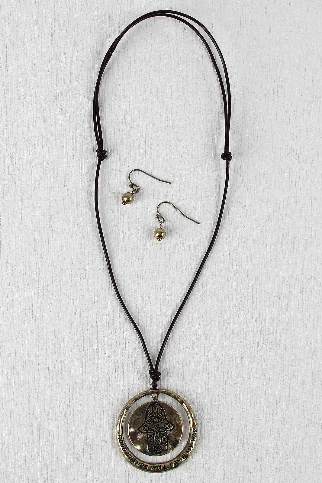 This adjustable sliding knot necklace features a pendant with hamsa etching with an idiom on the frame. Inscription reads, "Good Things Will Come My Way." Includes matching earrings. Nickel, Lead, and Cadmium Compliant.