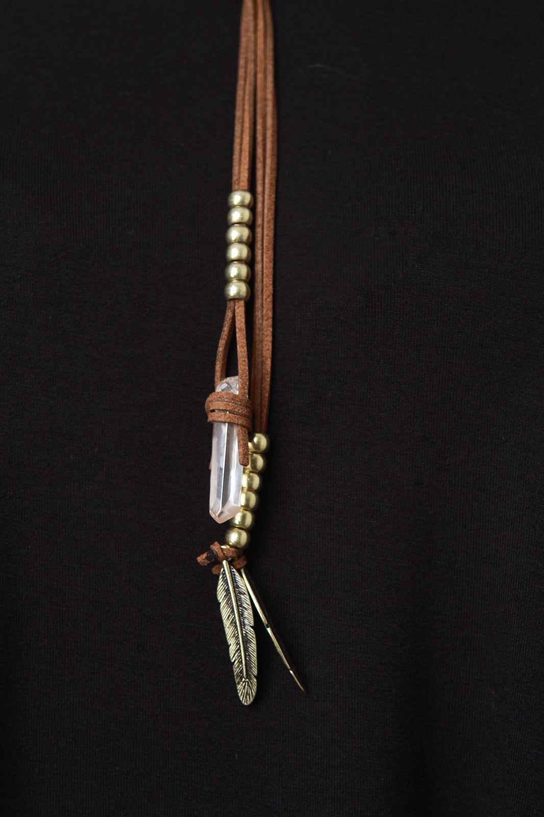 This layered necklace features a metal bar collar with triangle textures, a knotted faux suede cord necklace with crystal stone and feather charms, and beaded accents. Finished with an adjustable lobster hook closure.