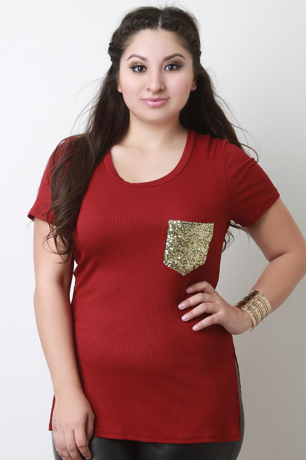 A plus size tee featuring a round neckline, ribbed jersey, and short sleeves. Finished with a glittery sequined breast pocket, high-low hemline, and side slits. Accessories sold separately. 97% Rayon, 3% Spandex.