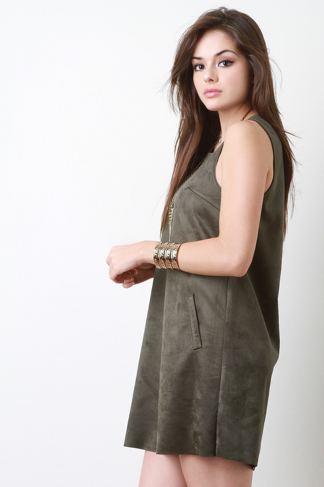 A sleeveless suede fabric, a round neckline, and faux pockets at the front. Finished with back zipper closure. Accessories sold separately. Made in U.S.A. 90% Polyester, 10% Spandex.