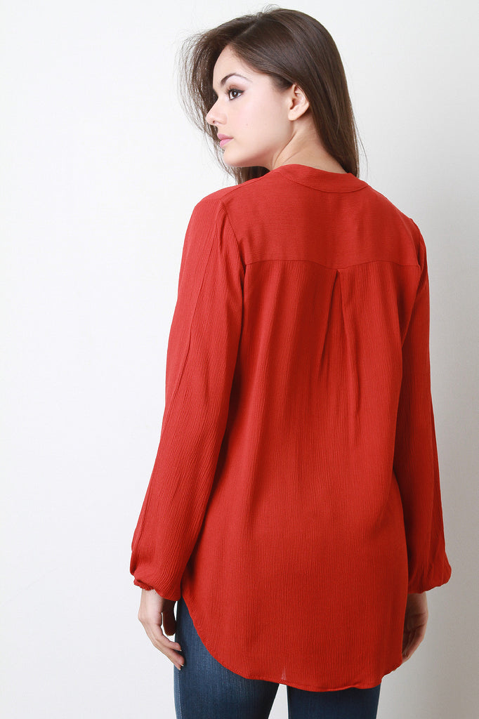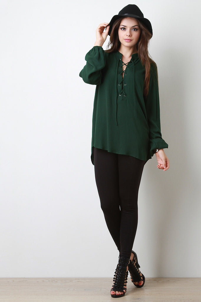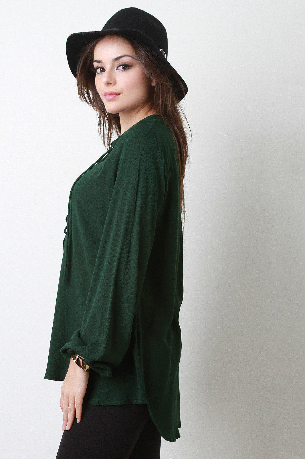 This lightweight chiffon blouse features a crepe texture throughout, a plunging v-neckline with lace up design, and long sleeves with elasticized cuffs. Finished with a high-low hemline. Accessories sold separately. Made in U.S.A. 100% Rayon.