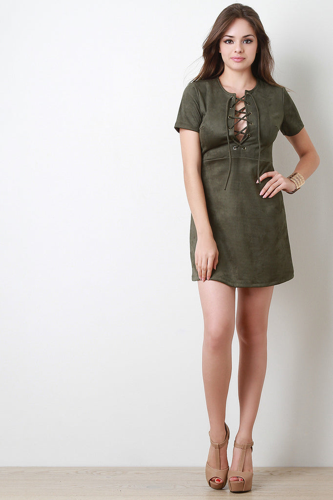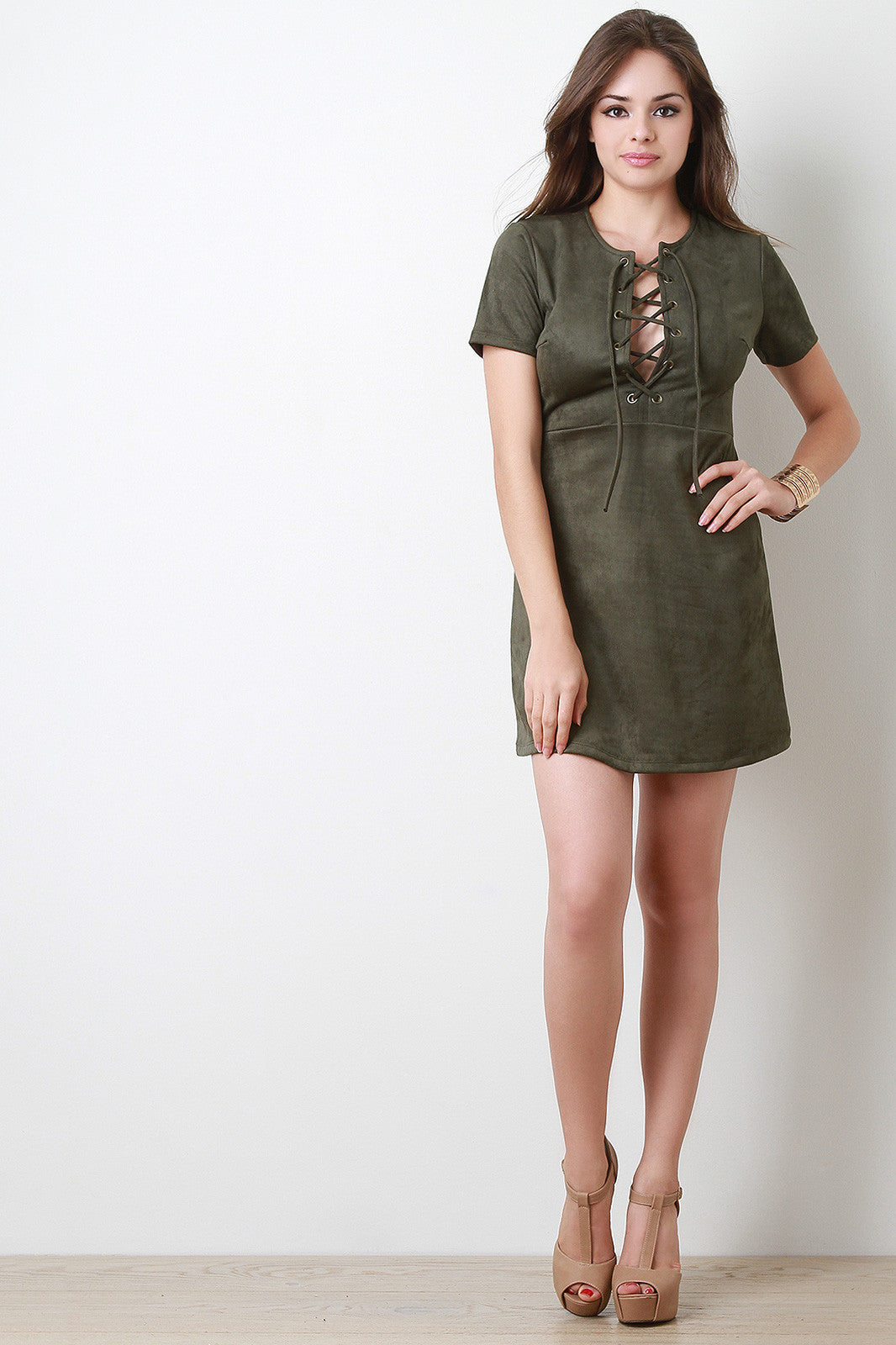 This A-line mini suede , round neckline, short sleeves, and an open front bodice with criss-cross lace up design. Accessories sold separately. Made in U.S.A. 90% Polyester, 10% Spandex.