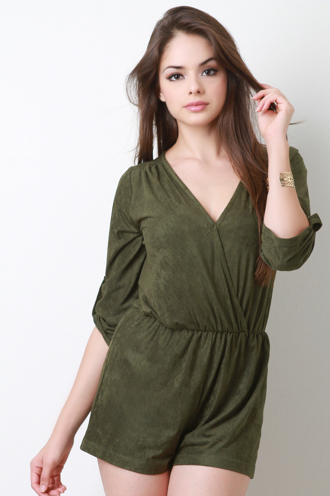 A romper featuring a surplice bodice, three-quarter sleeves with button strap accent, ruched elastic waist, and shorts bottom. Accessories sold separately. Made in U.S.A. 92% Polyester, 8% Spandex.