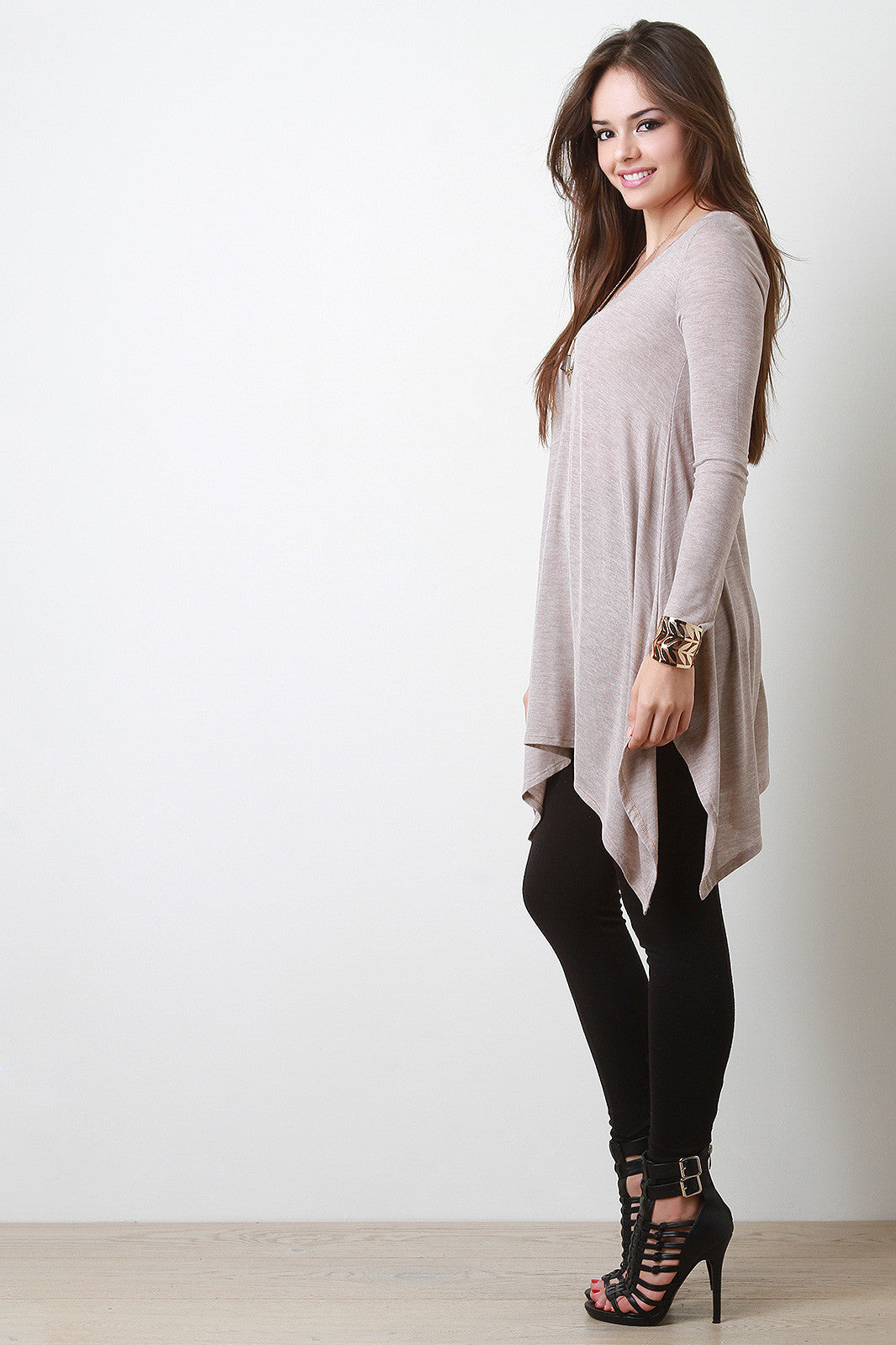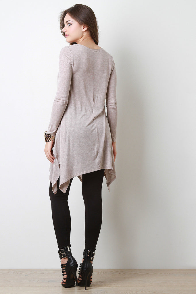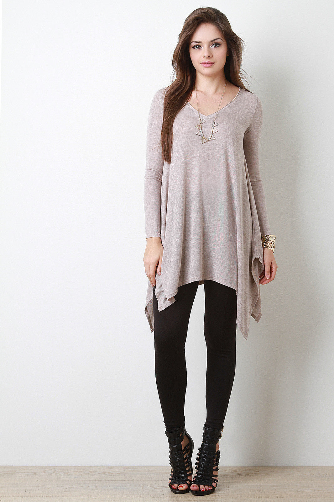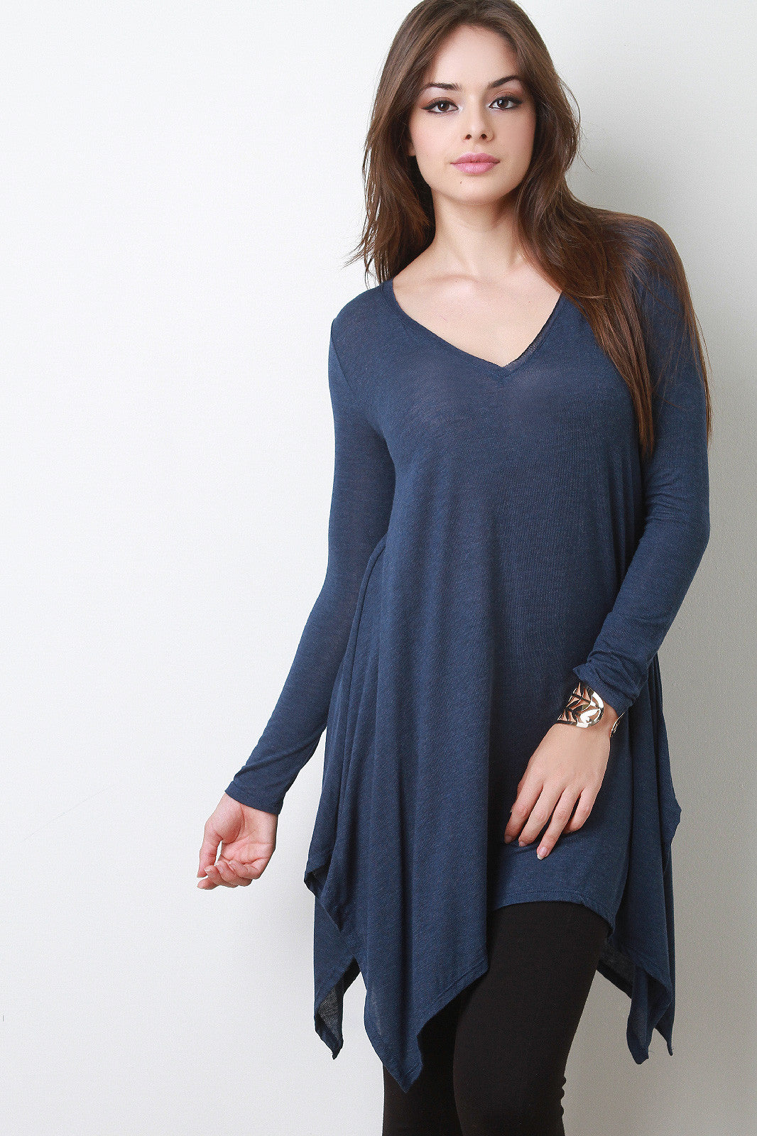 This semi-sheer jersey long top features a v-neckline, long fitted sleeves, and a relaxed fit bodice. Finished with a handkerchief hemline. Accessories sold separately. Made in U.S.A. 95% Rayon, 5% Spandex.