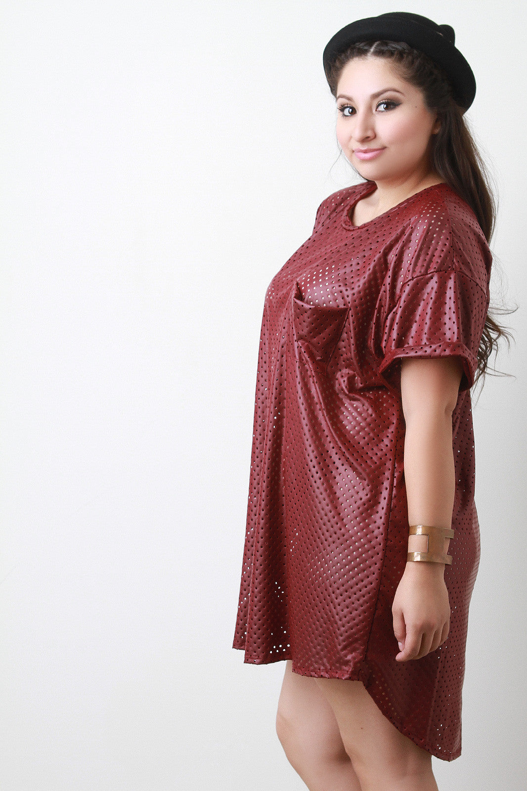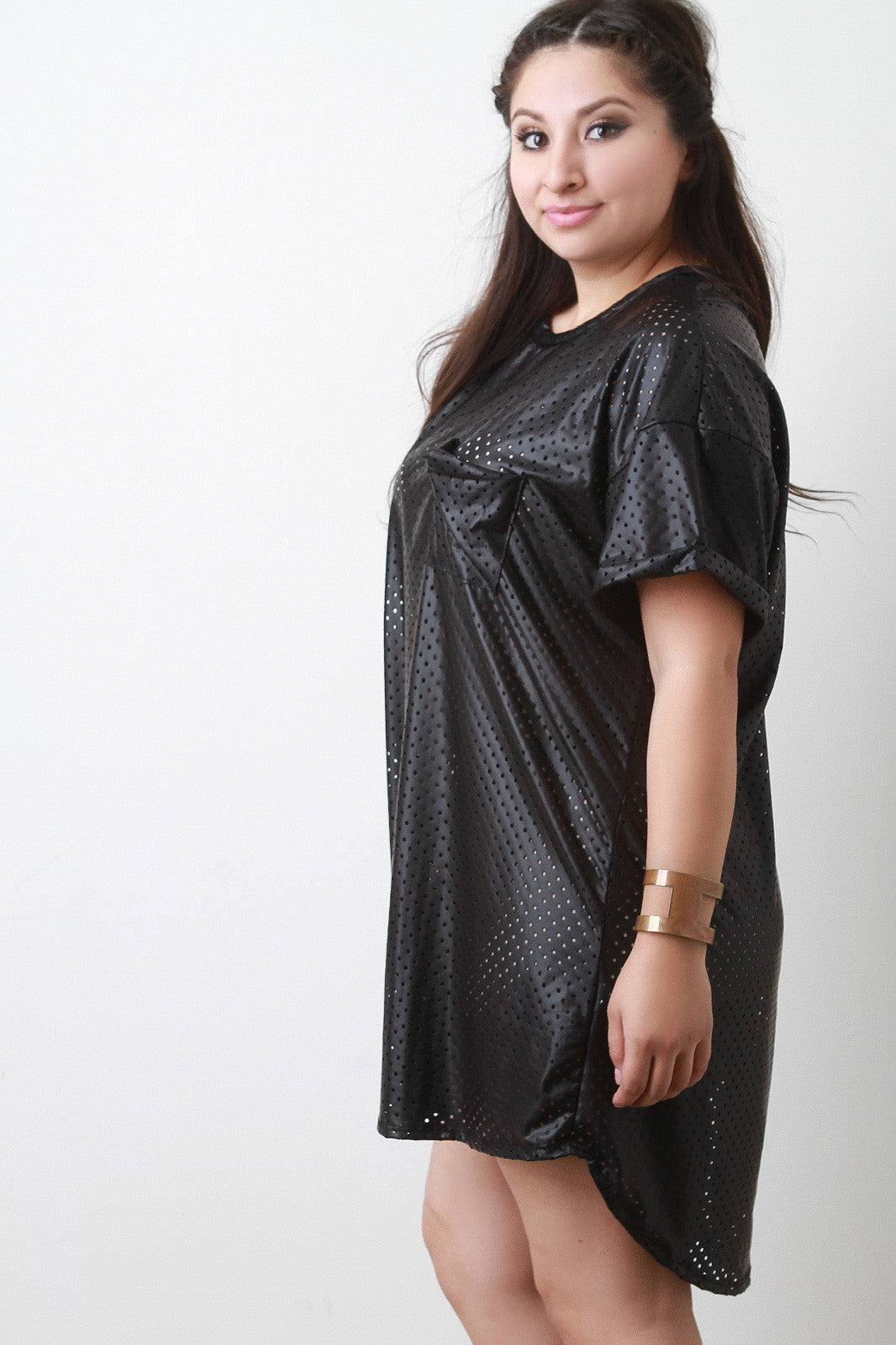 This plus size dress features vegan leather fabrication, semi-sheer eyelet construction, round neckline, short cuff sleeves, left breast pocket, and rounded high low hemline. Accessories sold separately. Made in U.S.A. 95% Polyester, 5% Spandex.