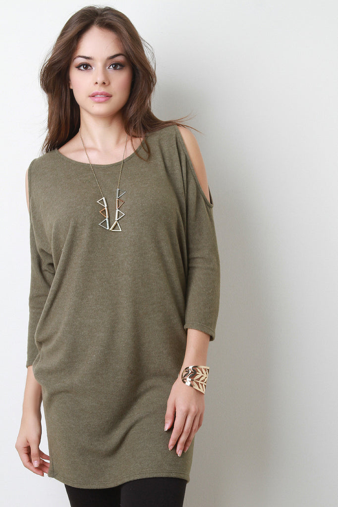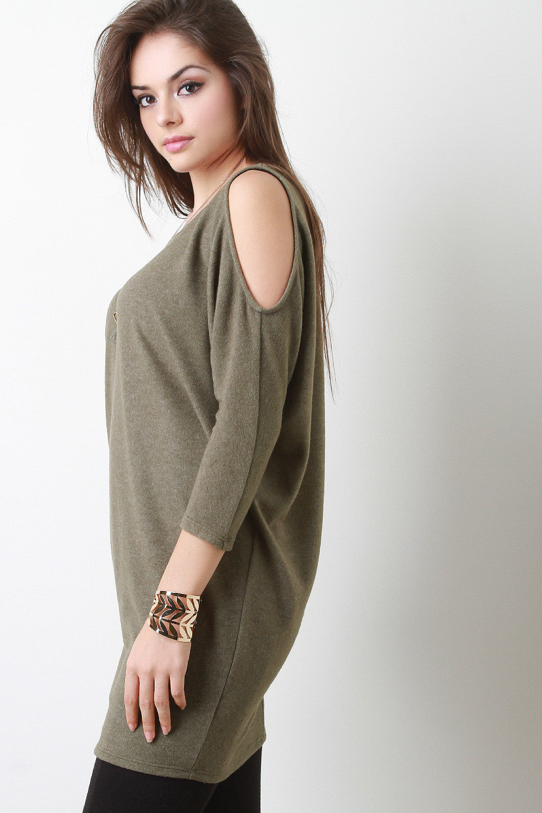 A long top featuring a cozy fleece material, round neckline and three-quarters dolman sleeves with cold shoulders. Accessories sold separately. Made in U.S.A. 77% Polyester, 19% Rayon, 4% Spandex.