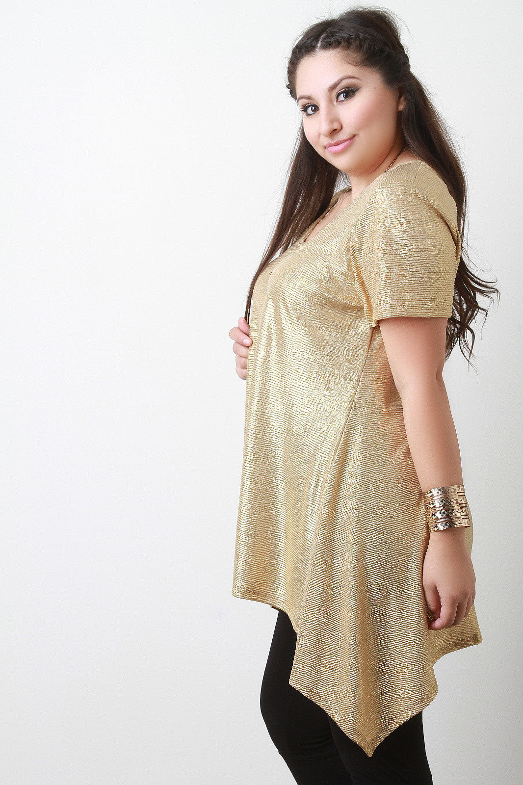 This plus size tunic top features a crinkled metallic foil knit fabrication, scooped neckline, short sleeves design, and asymmetrical sharkbite hemline. Accessories sold separately. Made in U.S.A. 97% Polyester, 3% Spandex.