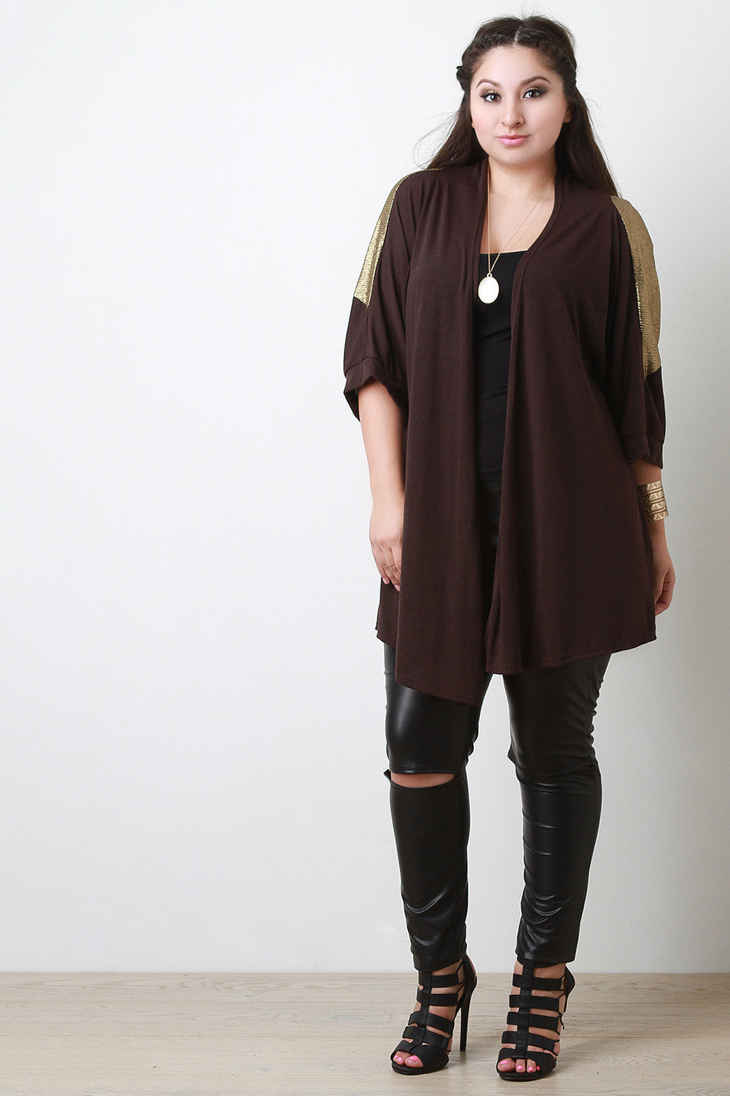 This plus size cardigan features an open front with shawl collar design, dolman sleeves, relax fit, crinkled metallic foil trim at the back, and asymmetrical hemline. Accessories sold separately. 87% Polyester, 10% Rayon, 2% Spandex.