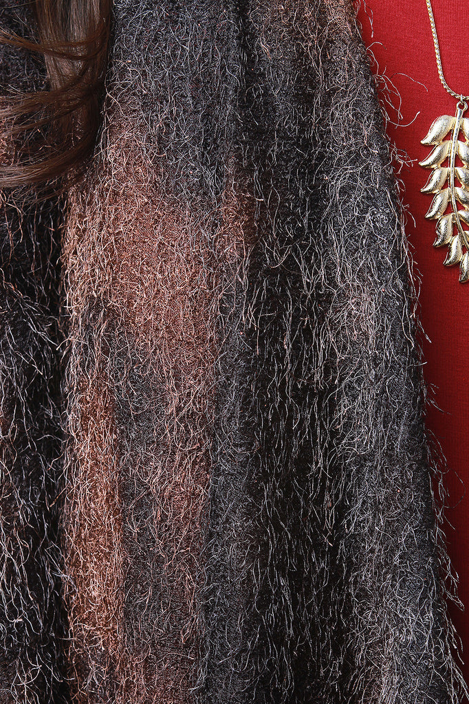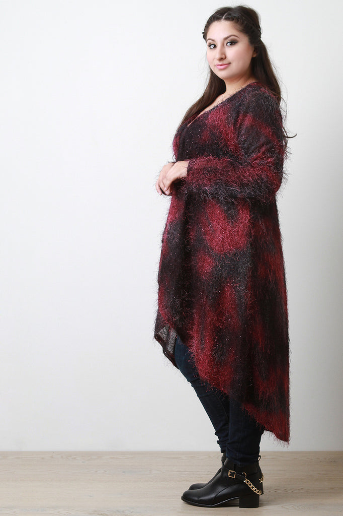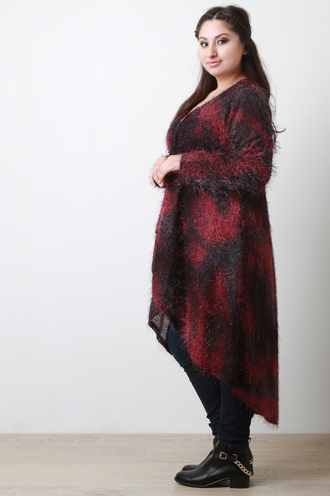 This plus size longline cardigan features a two tone fuzzy knit fabrication, slightly glittery accents, draped open front design, long sleeves, and finished with asymmetrical hemline. Accessories sold separately. Made in U.S.A. 96% Polyester, 4% Spandex.